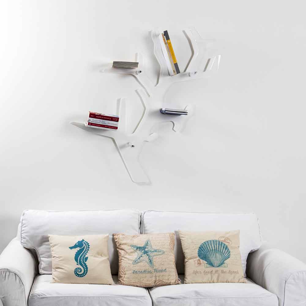Sensaciones marítimas para la librería de pared Carol, realizada con precisos cortes láser para darle la forma de una auténtica joya del mar. La parte frontal de plexiglás transparente, que refleja la parte trasera, disponible en color blanco liso, aporta un toque de elegancia al ambiente del hogar. Tanto la base transparente como el estante están fabricados en cristal acrílico PMMA polímero 100% virgen. El brillo y el brillo se mantienen constantes e inalterados en el tiempo. El polímero virgen PMMA plexiglás utilizado no es tóxico, es hipoalergénico, inodoro y antibacteriano. 100% reciclable. Cumple con la norma UNI EN 71-3:200. Concebido, diseñado y fabricado en Italia, con materiales italianos.