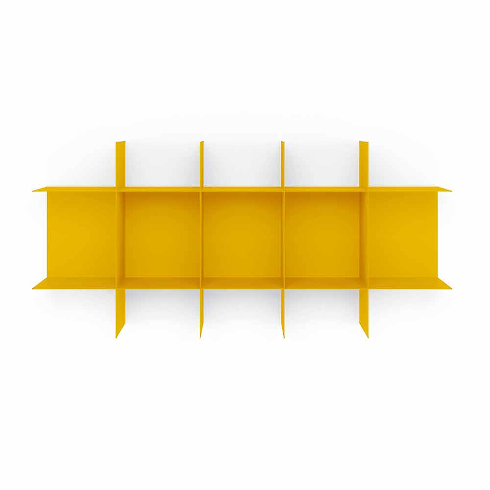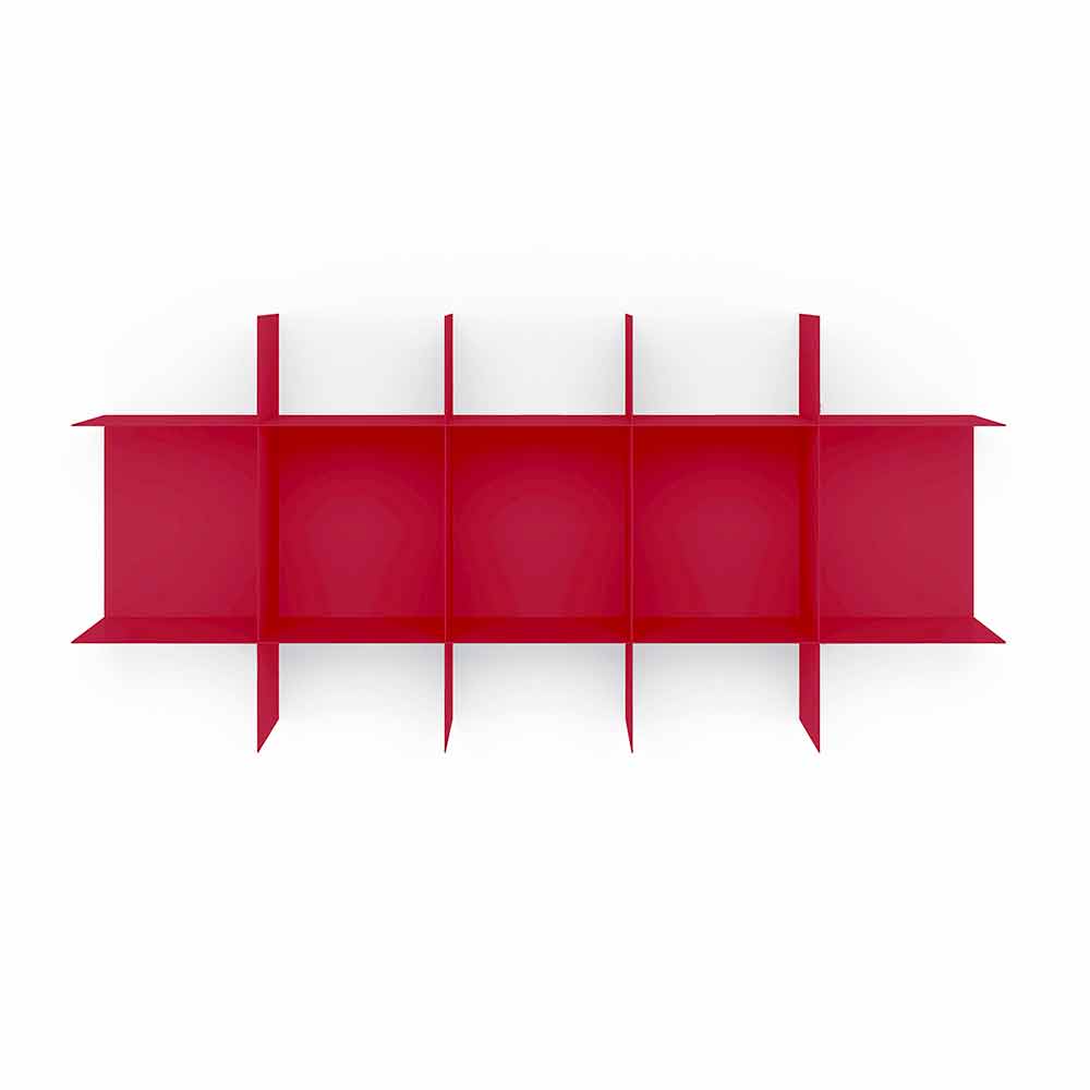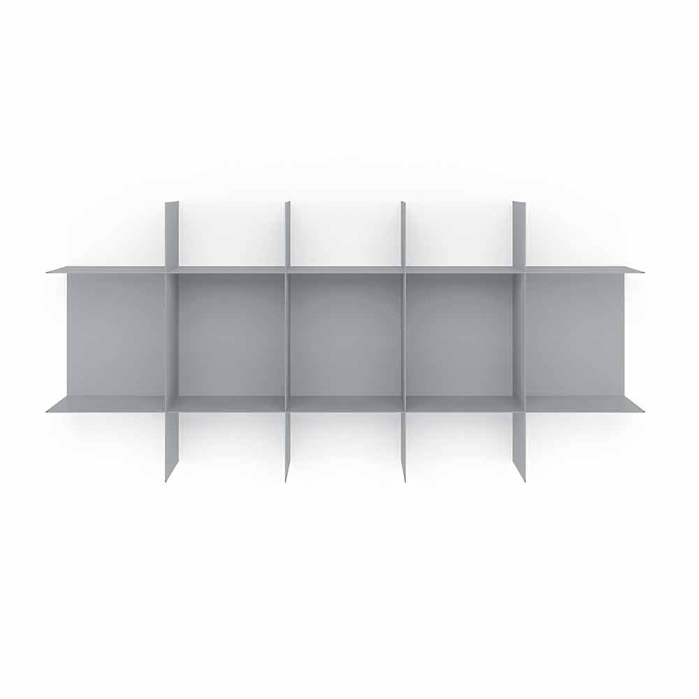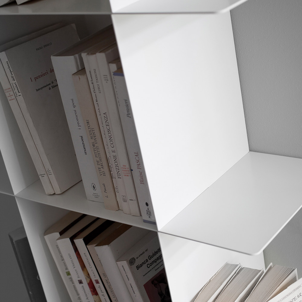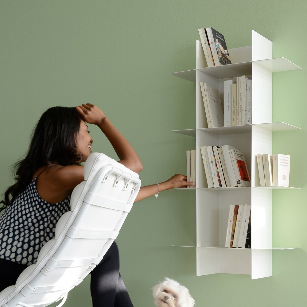 Esta librería modular de acero consta de un módulo básico central para fijar a la pared y cuatro estantes que encajan perfectamente en el módulo formando un patrón de compartimentos cuadrados, con un diseño geométrico y contemporáneo , elegante y refinado en su sencillez.