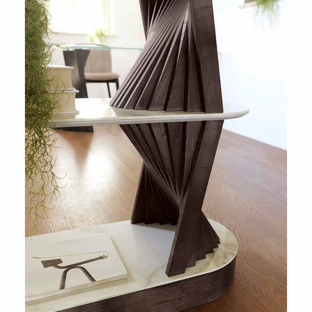 Librería de diseño de suelo en madera de fresno con estantes de gres, producto Made in Italy de alta calidad.