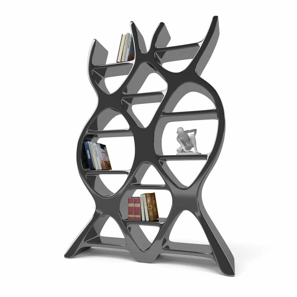 Más allá de la librería, una escultura inspirada en el ADN, fuente de vida y conocimiento. Las líneas suaves y sinuosas, combinadas con un fuerte impacto escénico, hacen que la librería DNA sea apta como un mueble exclusivo dentro del hogar. Sus formas fuera de lo común también lo hacen ideal para ambientes dedicados a bares literarios o bibliotecas de café. Estructura de Solid Surface, disponible en diferentes colores: Negro (RAL9005), Rojo Rubí (RAL3003) o Blanco Perla (RAL1013).