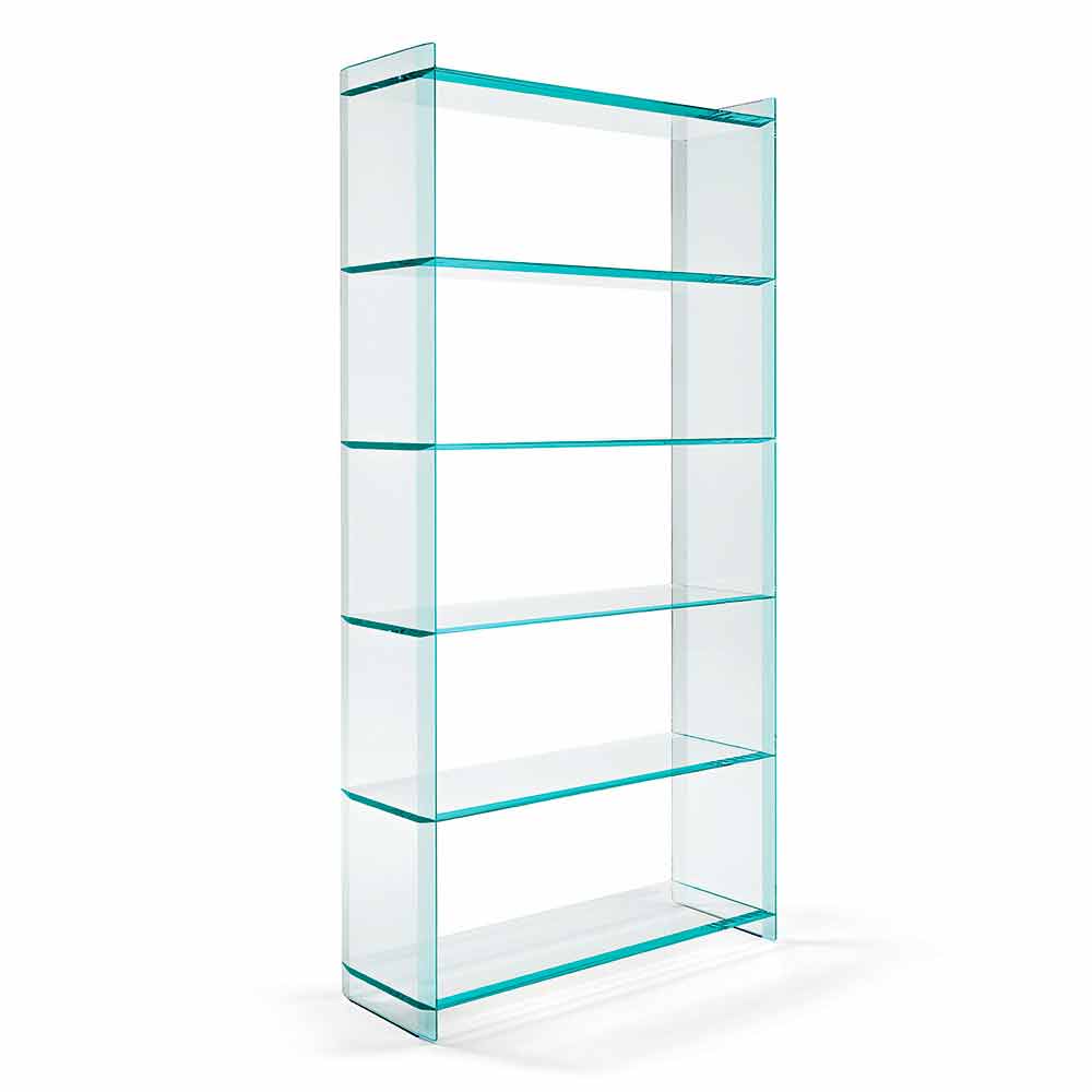 Esta librería de salón se caracteriza por su diseño intrigante y elegante, totalmente realizado en cristal extraclaro con bisel de 5 cm.
