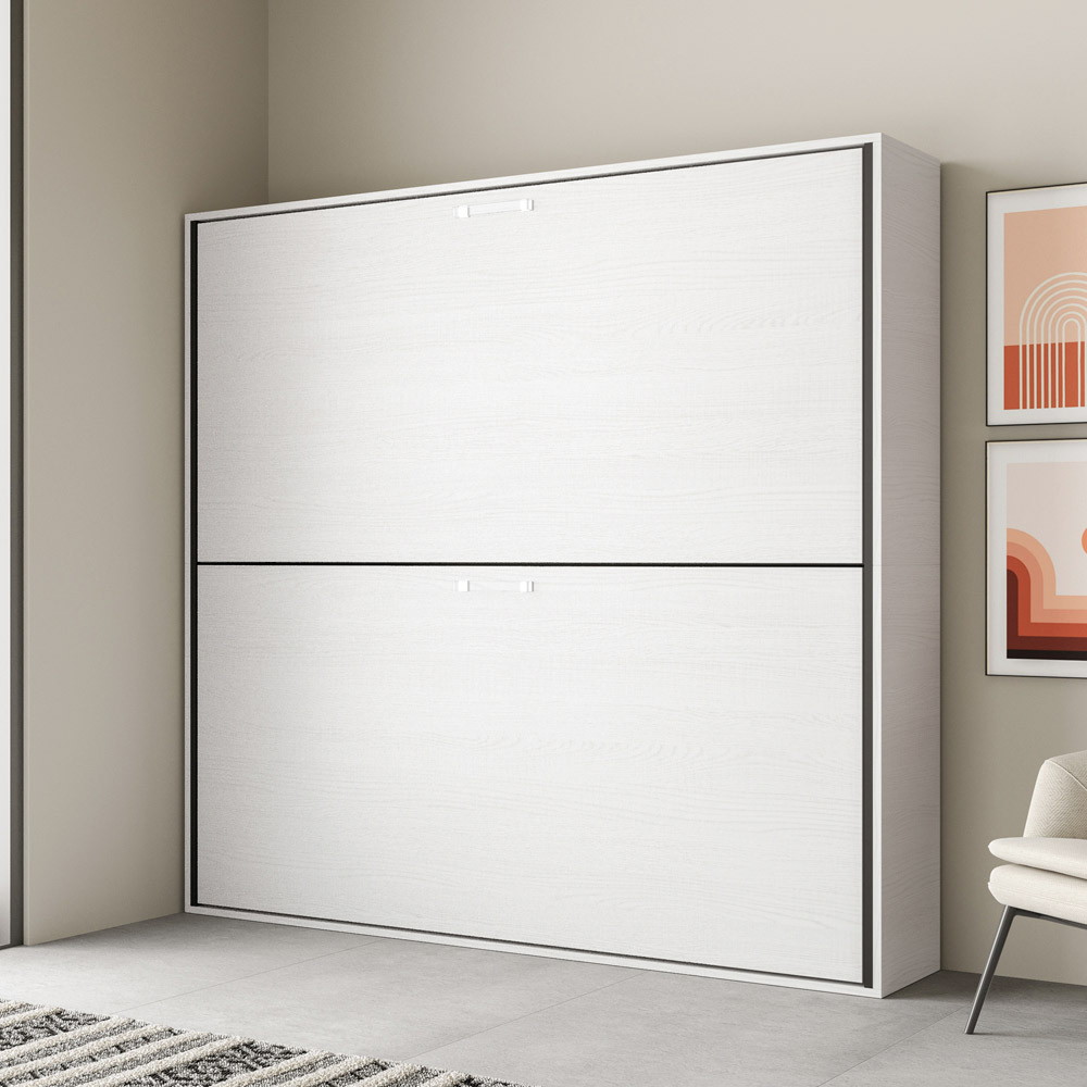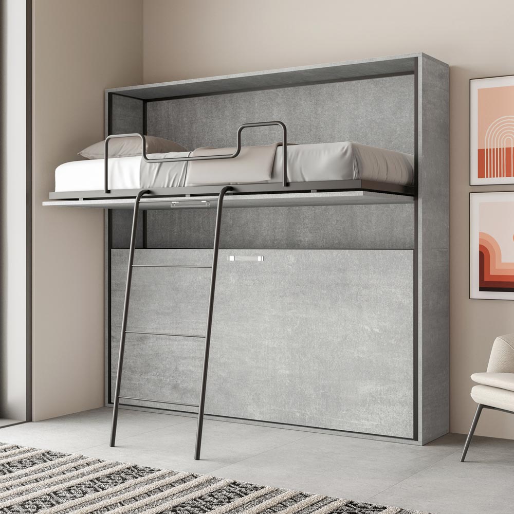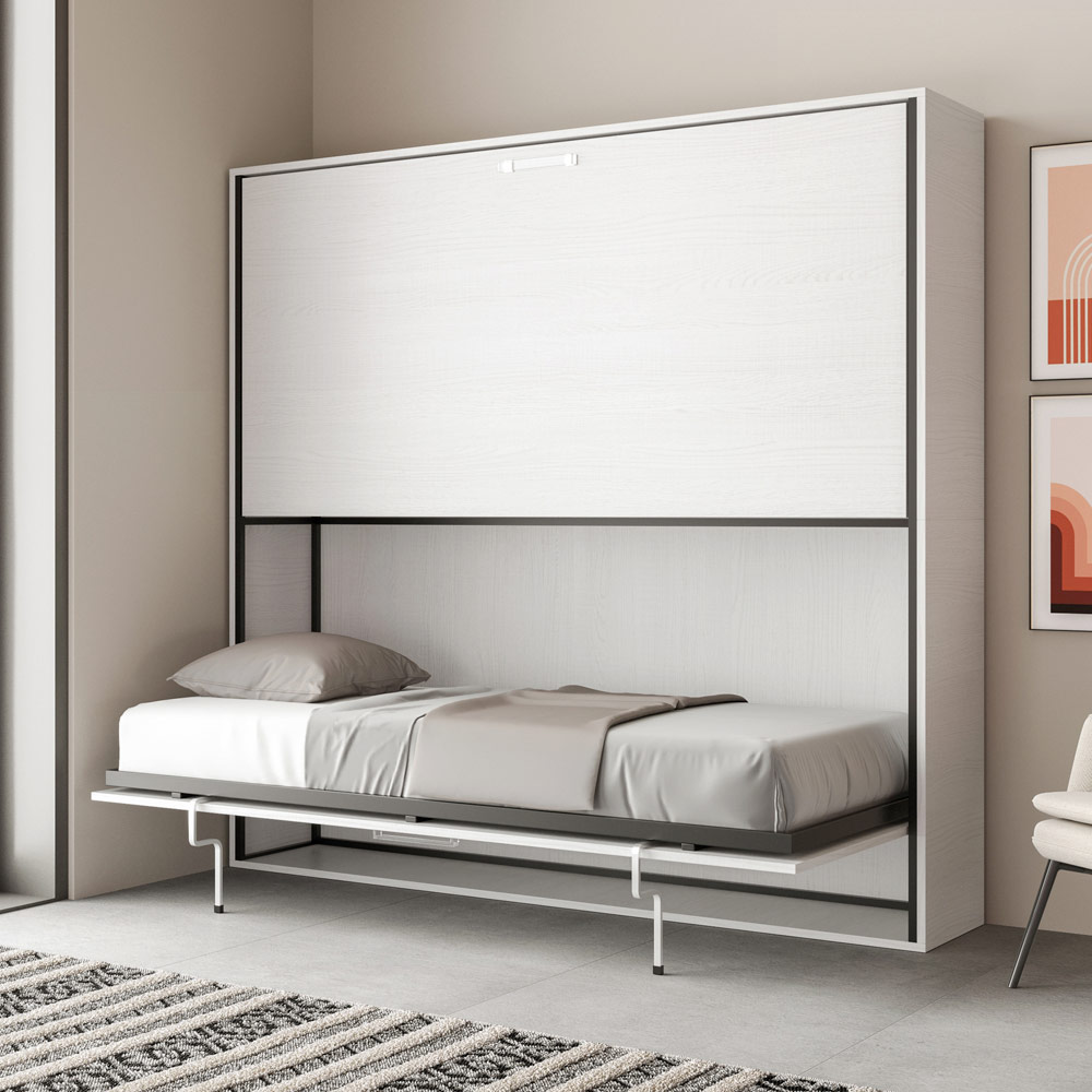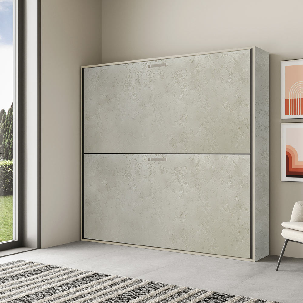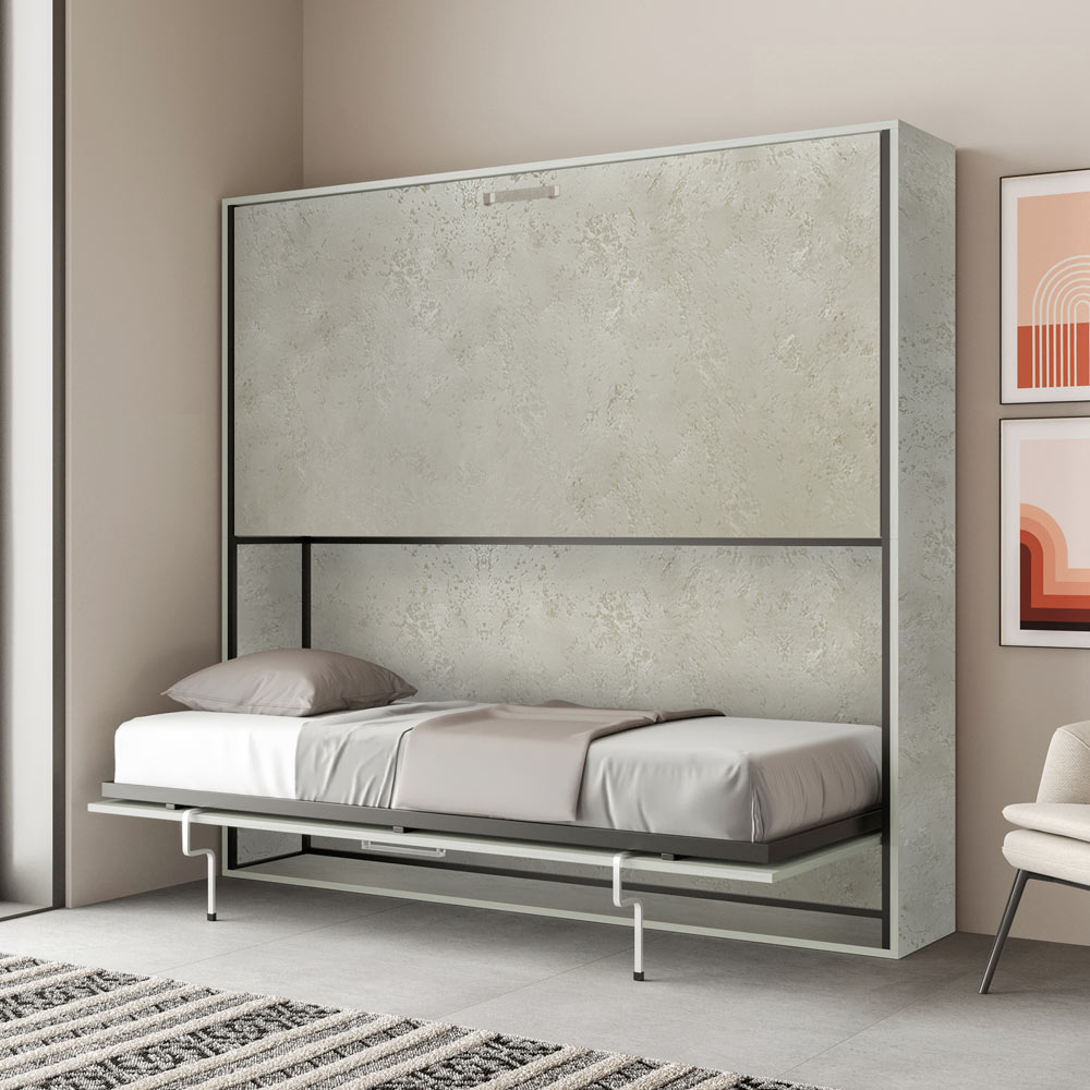 Cama abatible horizontal realizada con estructura en paneles de partículas de madera ennoblecidas de 18 mm de espesor, estructura del somier en hierro reforzado pintado con polvo epoxi en color aluminio gofrado.