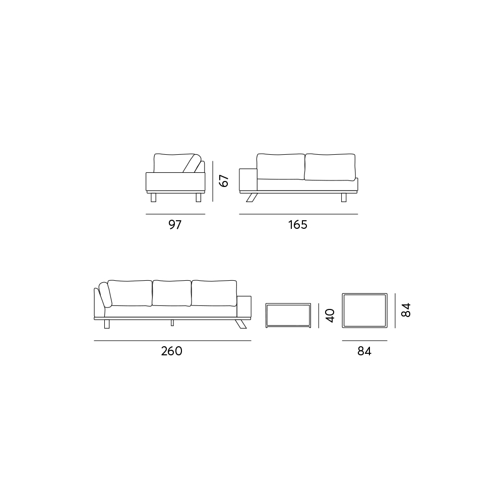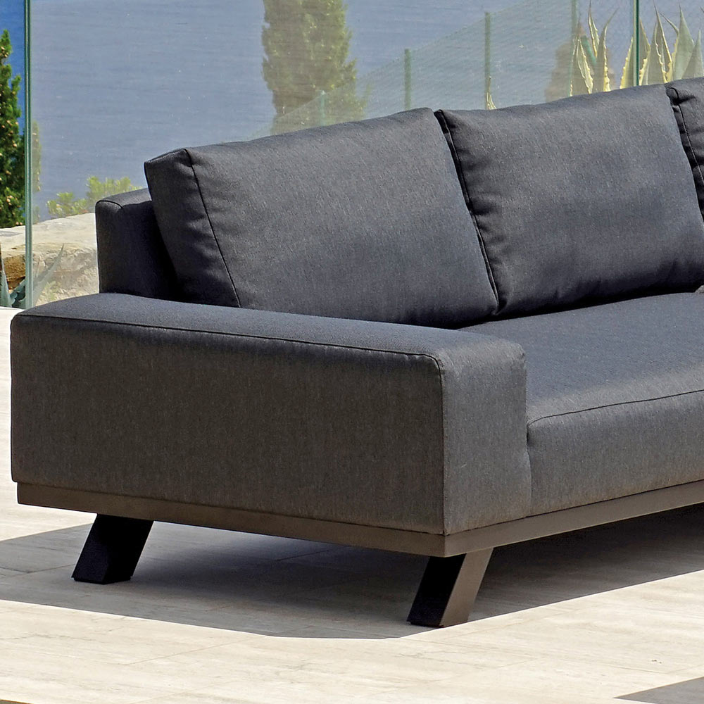 Composición de jardín compuesta por un sofá de 3 plazas y un sofá de 2 plazas con cojines y reposabrazos en textilene suave negro con acolchado de secado rápido y una mesa de centro con tapa de cerámica y estructura de aluminio negro . Tornillos de acero inoxidable incluidos. Un salón de exterior caracterizado por un estilo neutro y elegante cuya estética está subrayada por formas esenciales que se adaptan perfectamente a cualquier estilo de mobiliario.