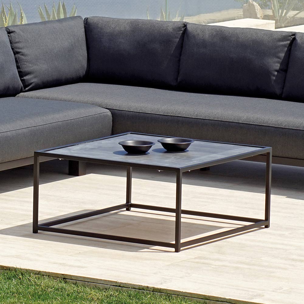 Salón de jardín con 2 sofás, estructura de aluminio negro y mesa de centro de cerámica.