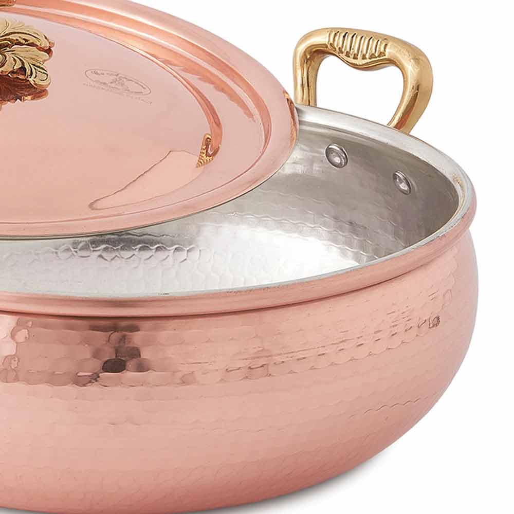 Este práctico y funcional plato de verduras con tapa y asas de latón es una cacerola redondeada en cobre macizo martillado ideal para cocciones lentas como legumbres, salsa de carne y caza, etc.
