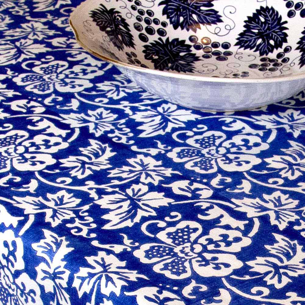 Mantel italiano de alta calidad en lino puro, totalmente impreso a mano en azul u óxido con moldes de madera con un diseño artístico de un rosetón, una pieza única y de calidad hecha en Italia.