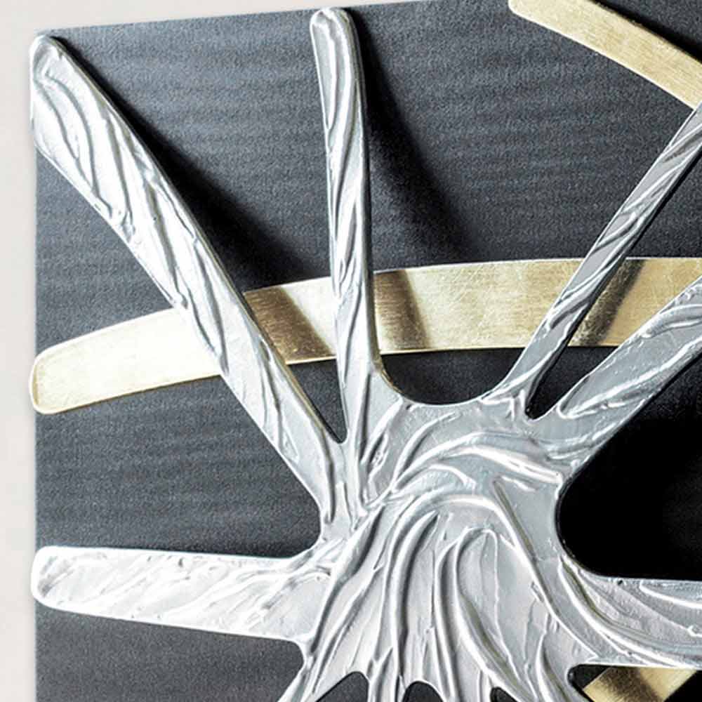 Estructuras curvadas sobrepuestas con matérico de cerámica, decoradas a mano, oro y plata sobre panel tela lacado negro, retoque lúcido.