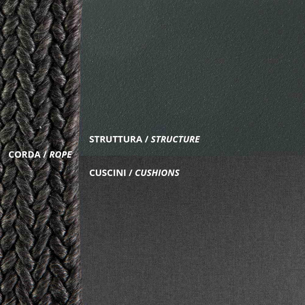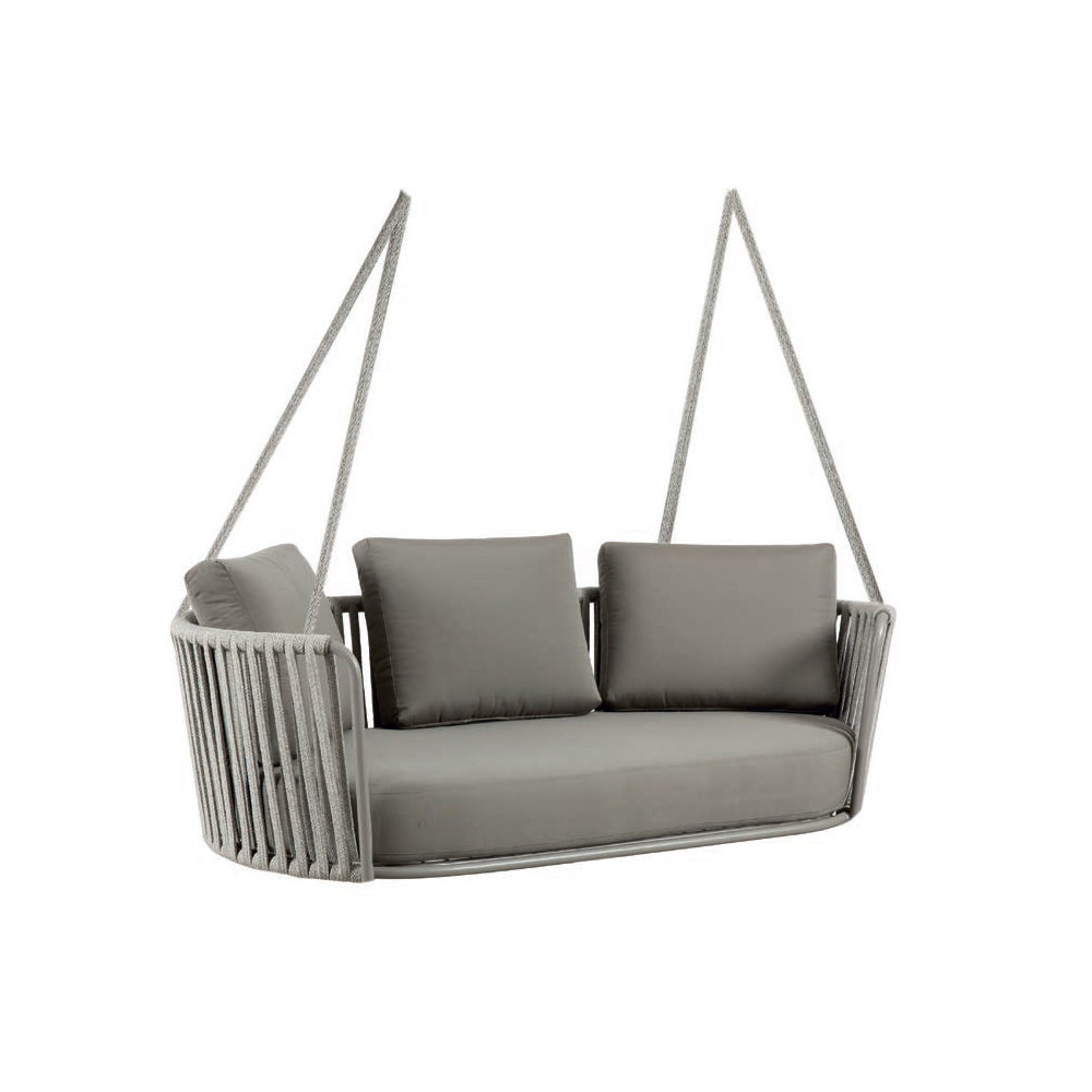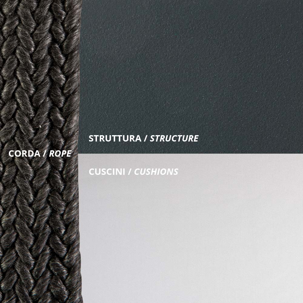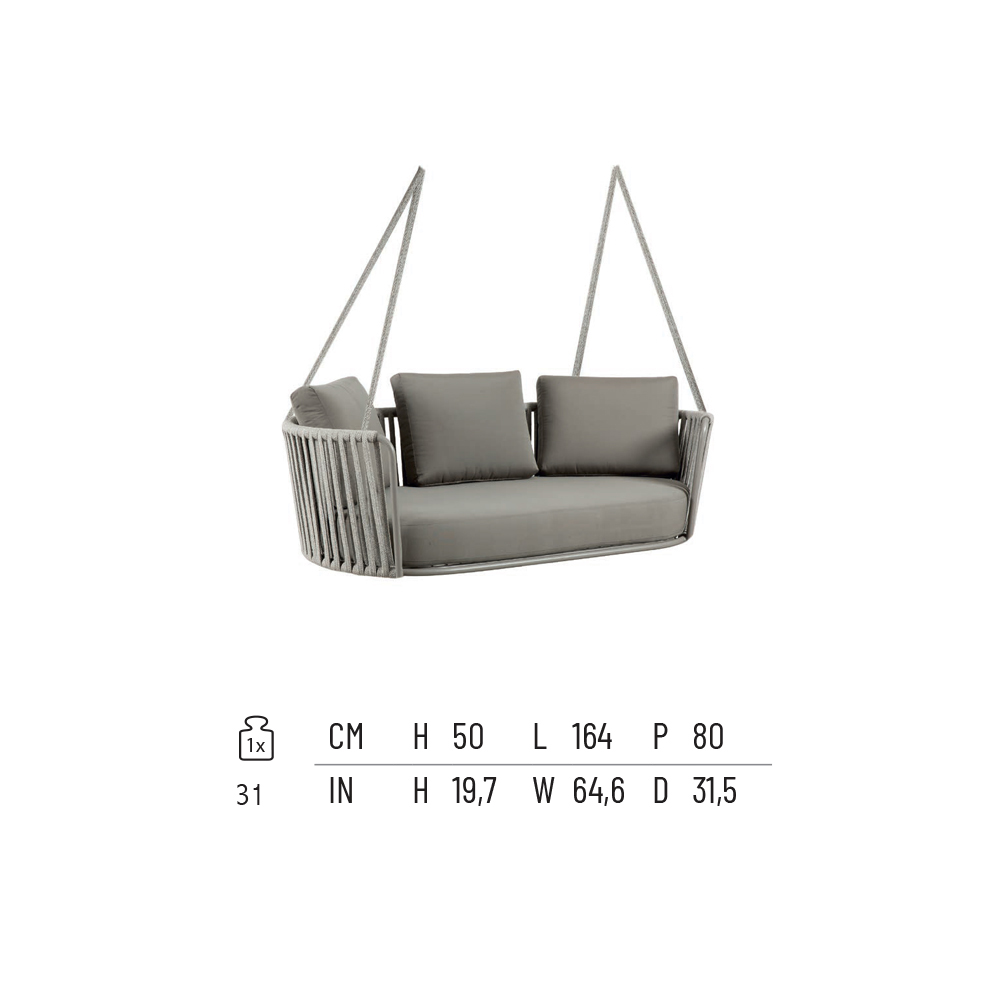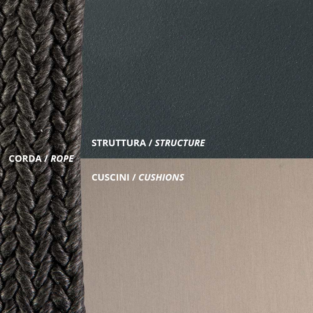Columpio de jardín de dos plazas,fabricado íntegramente en Italia, con estructura de hierro galvanizado con recubrimiento en polvo, pintado en gris antiguo y cuerda negra , y asiento tapizado en tejido 100 % polipropileno . Ligereza y resistencia se unen para crear un mueble informal y singular, caracterizado por un diseño original y refinado. El asiento amplio y ergonómico, junto con su forma acogedora y armoniosa, proporciona una comodidad óptima, mientras que la elegante combinación de materiales seleccionados confiere al producto un carácter refinado y un estilo contemporáneo .