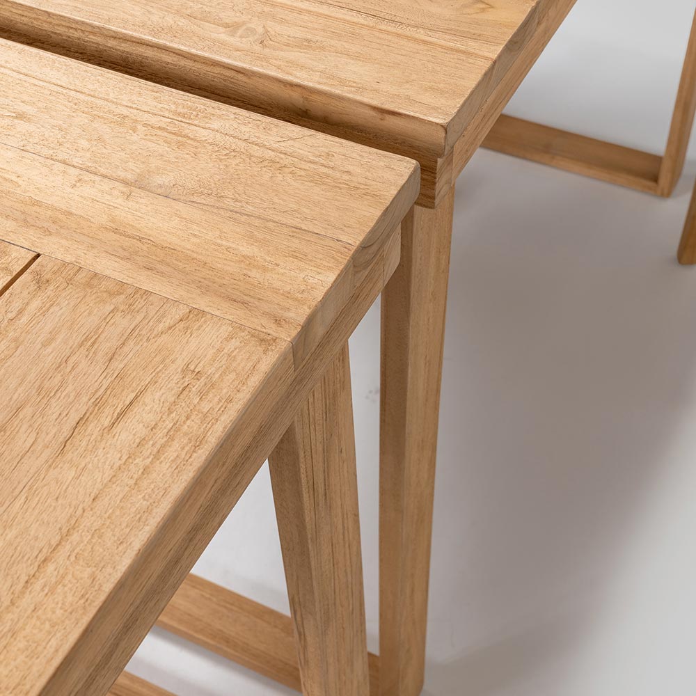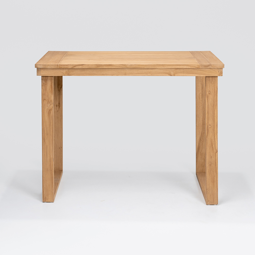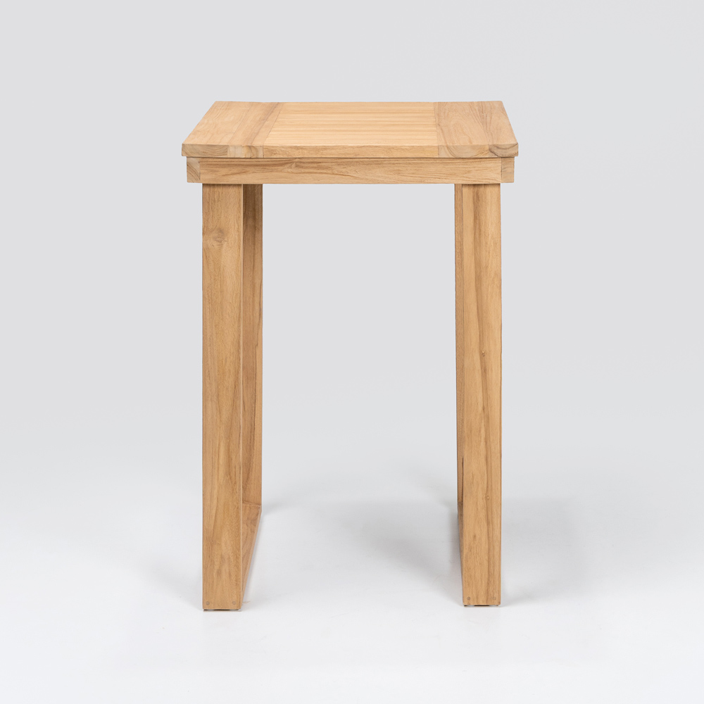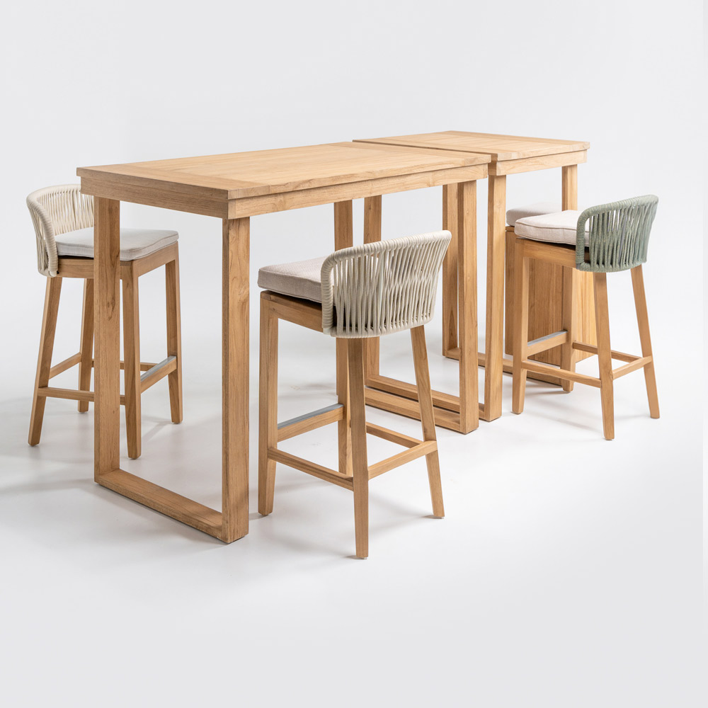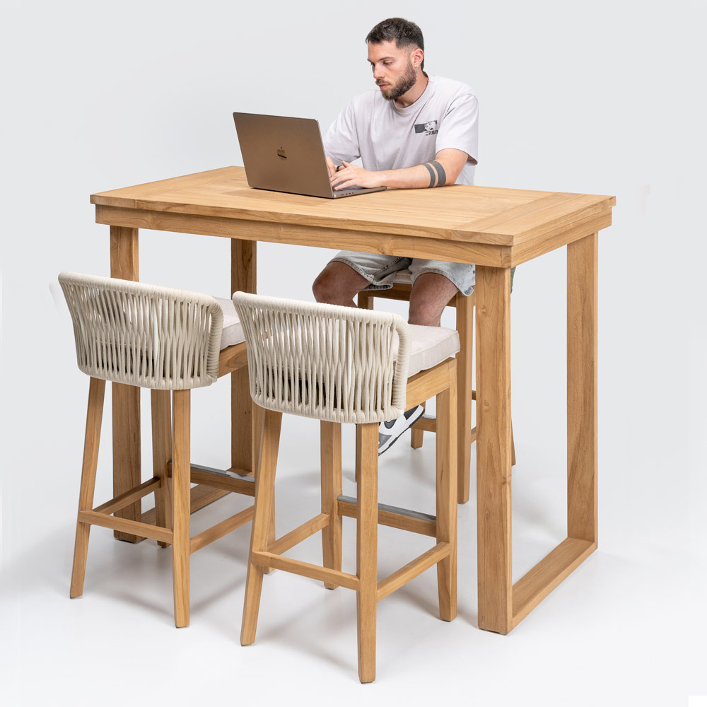 Esta elegante mesa alta de bar combina a la perfección un diseño sofisticado con materiales naturales . Fabricada con una sólida estructura de teca natural cepillada , cada detalle está diseñado para garantizar durabilidad y resistencia , mientras que el tablero de teca natural cepillada ofrece una superficie lisa y refinada que realza la belleza de la madera con su veta única .