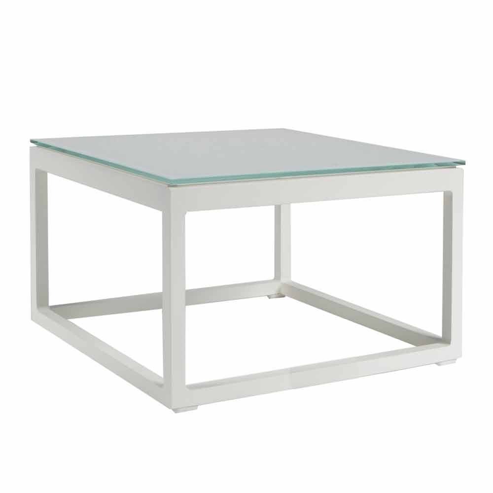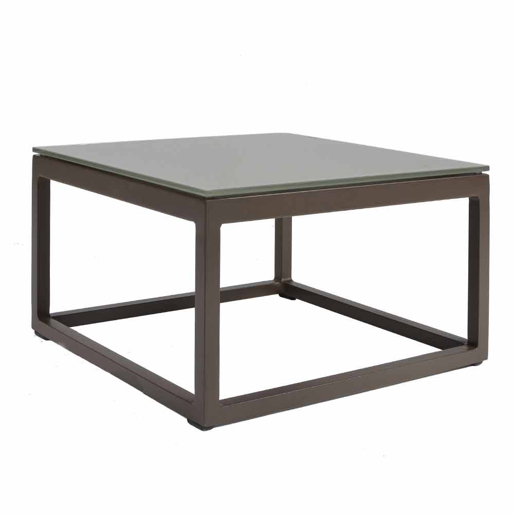 Mesa baja de exterior con estructura de aluminio en 3 acabados y tapa cuadrada de cristal o laminado.