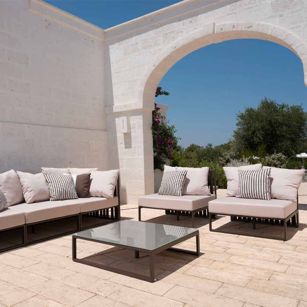 El diseño refinado , elegante y refinado de esta mesa de centro de jardín se caracteriza por la alternancia de espacios vacíos y llenos que crea una apariencia visual ligera y contemporánea.