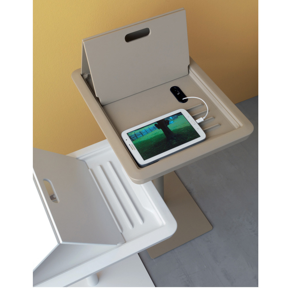 Esta mesa de cafétiene una base de metalpintado en polvo y una tapa de pvc del mismo color que se puede abrir y modular. Está concebido y diseñado para soporte de tableta, con un orificio para el paso del cable. De esta forma, el diseño del complemento permite utilizar y almacenar cada objeto correctamente, manteniendo también en orden los cables necesarios. La peculiaridad viene dada por la altura regulable de 45 a 65 cm para obtener el máximo confort utilizando dispositivos digitales, respondiendo así a las necesidades domésticas más actuales.