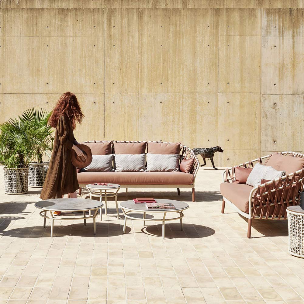 diseño lineal, limpio y funcional, esta mesa de centro es perfecta para amueblar ambientes exteriores como terrazas, piscinas y jardines, a la vez que encuentra su lugar en las distintas zonas de estar interiores.