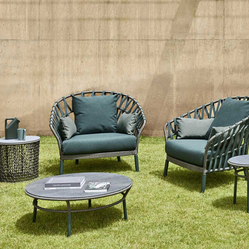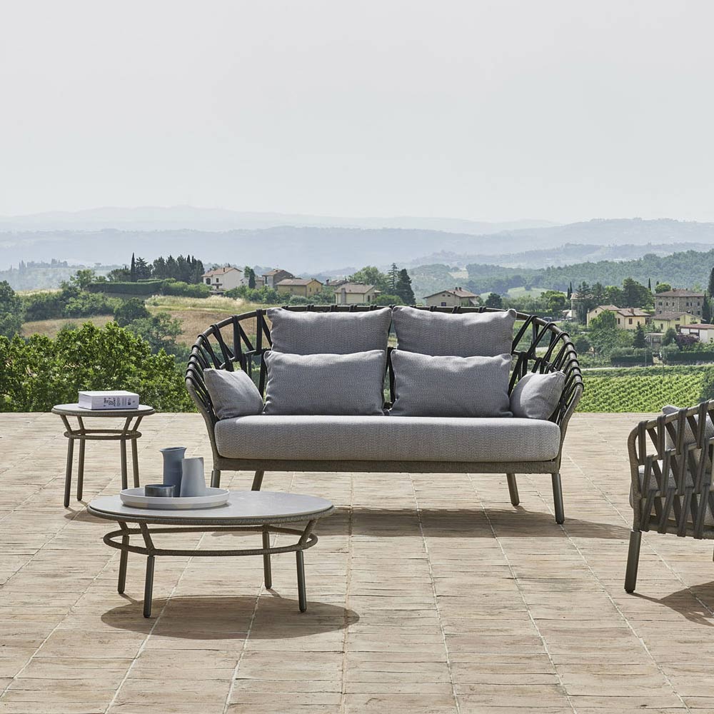 Mesa de jardín redonda con estructura de aluminio y tejido de cuerda Made in Italy.