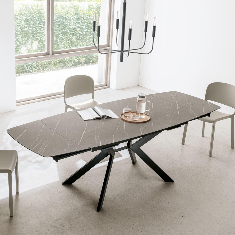 Elegancia y practicidad se unen en esta mesa extensible en HPL y metal , diseñada para quienes desean un mueble de fuerte impacto visual, pero extremadamente funcional.