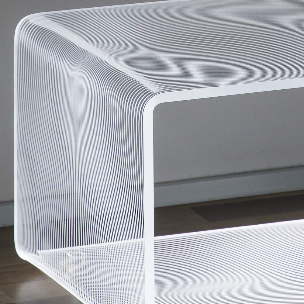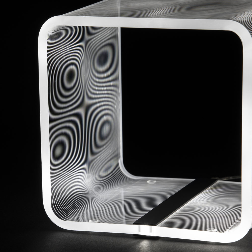 Realizado íntegramente en cristal acrílico plegado disponible en 2 variantes de texturas grabadas con marcado láser que realzan los matices cromáticos, también incluye el mando a distancia para el máximo confort.