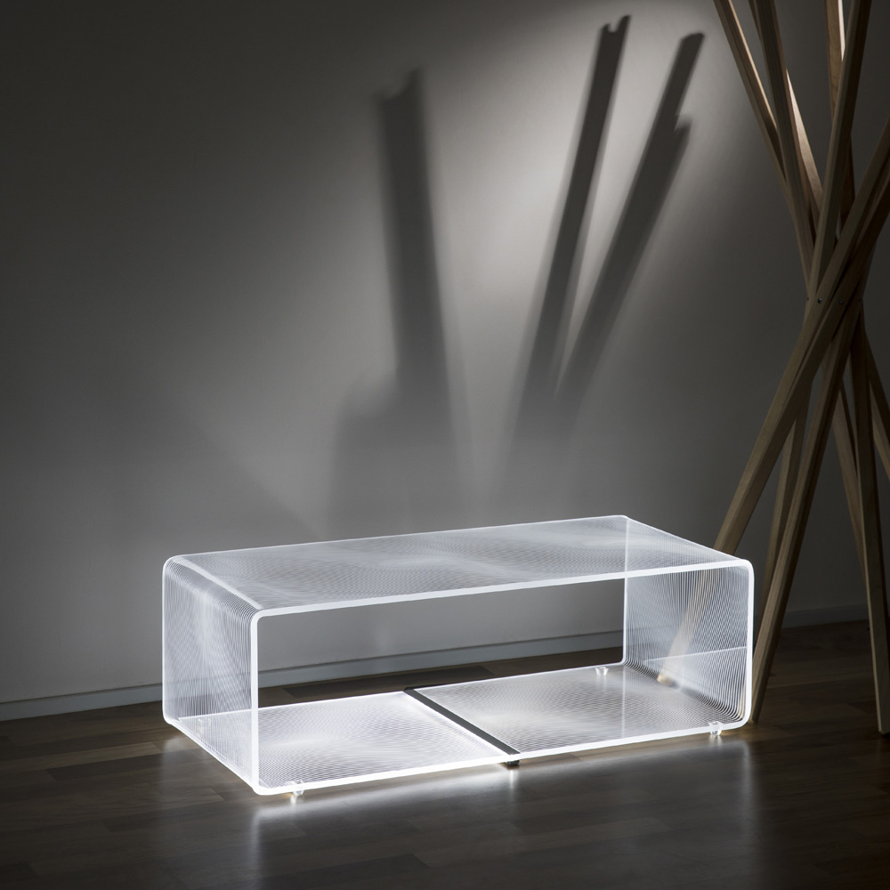 Mesa de centro luminosa con LED RGB en acrílico transparente 2 variantes y 2 tamaños made in Italy.