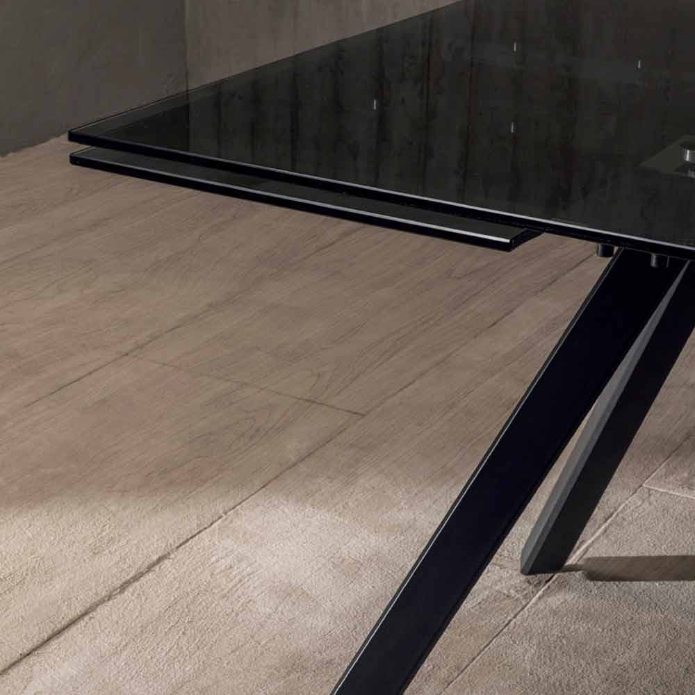 El aspecto de diseño del producto es indudablemente conferido por la refinada tapa de vidrio templado en acabado negro ahumado transparente combinado con el metal pintado antracita mate de la estructura caracterizada por la peculiaridad de las patas oblicuas que hacen que el producto sea único en su género. En cambio, la practicidad y la funcionalidad vienen dadas por la posibilidad de extender la parte superior hasta 240 cm, lo que le permite acomodar un máximo de 12 personas para almuerzos y cenas familiares. Esto sucede gracias a la presencia de 2extensiones laterales de 40 cm cada una, también en vidrio negro ahumado, colocadas debajo del tablero y fácilmente extraíbles cuando sea necesario.