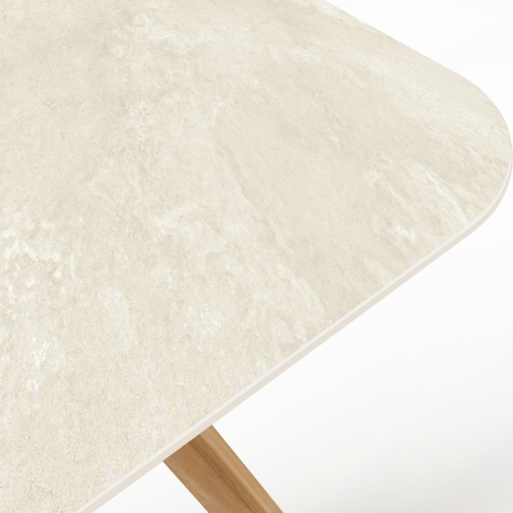 Made in Italy. Esta mesa de exterior es una pieza de diseño que realza cualquier espacio exterior gracias a su equilibrio entre elegancia natural y modernidad. Cuenta con un tablero de cerámica inspirado en la piedra de Chianca di Ostuni , conocida por su color neutro y textura que evoca la piedra natural, aportando un toque rústico y contemporáneo.