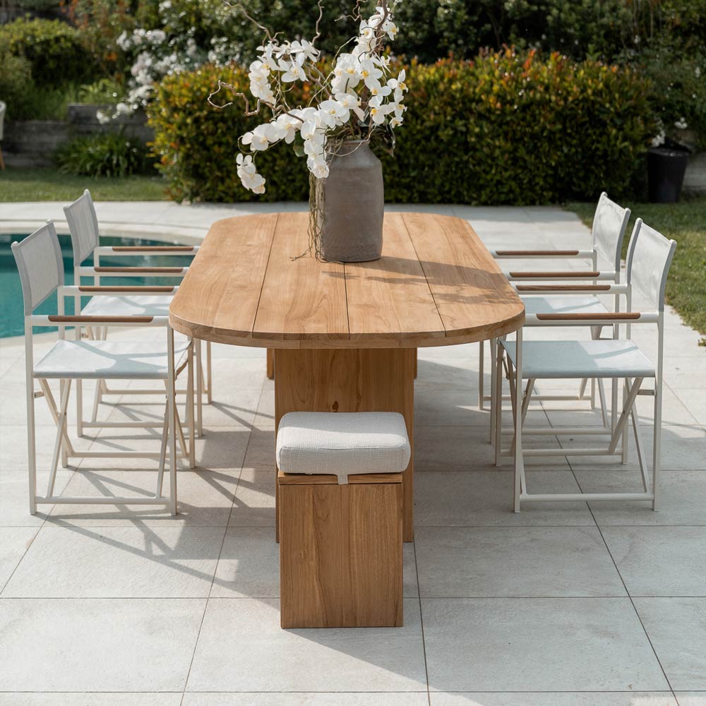 elemento sencillo pero de proporciones armoniosas , ideal para cualquier espacio exterior, como terrazas, porches, jardines o junto a la piscina, creando un ambiente cautivador. La madera de teca utilizada en su construcción garantiza