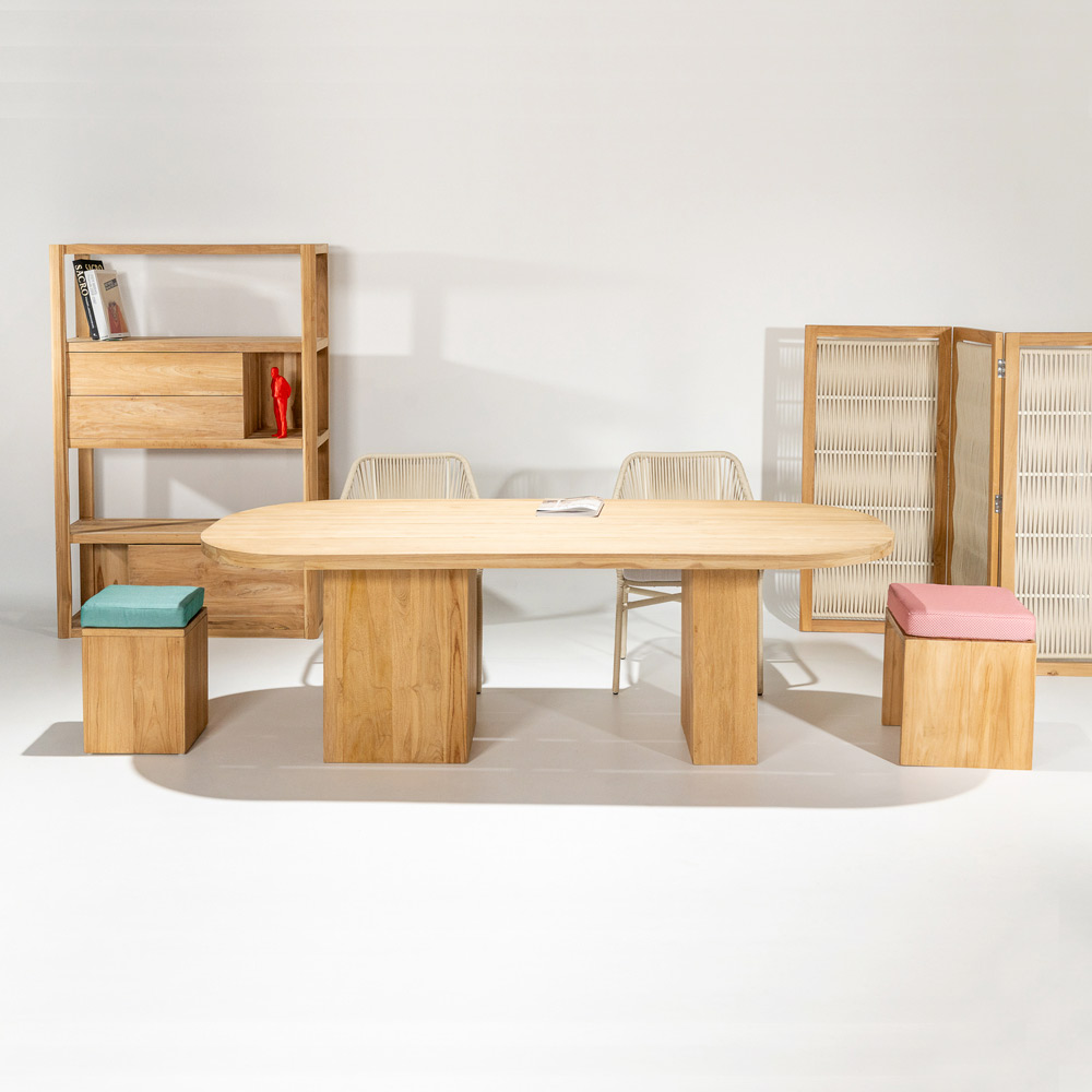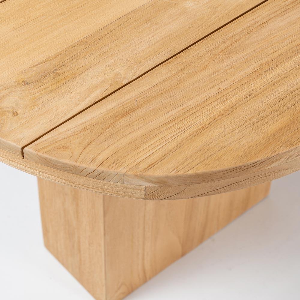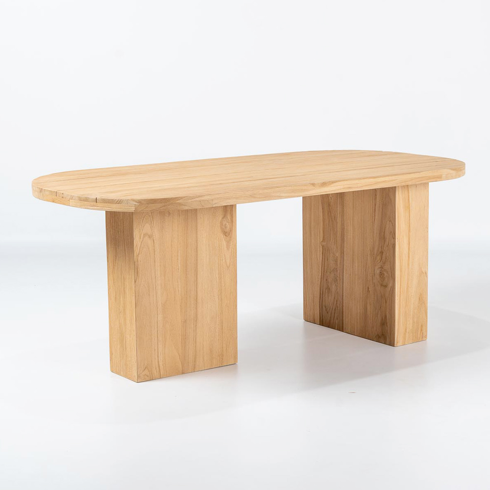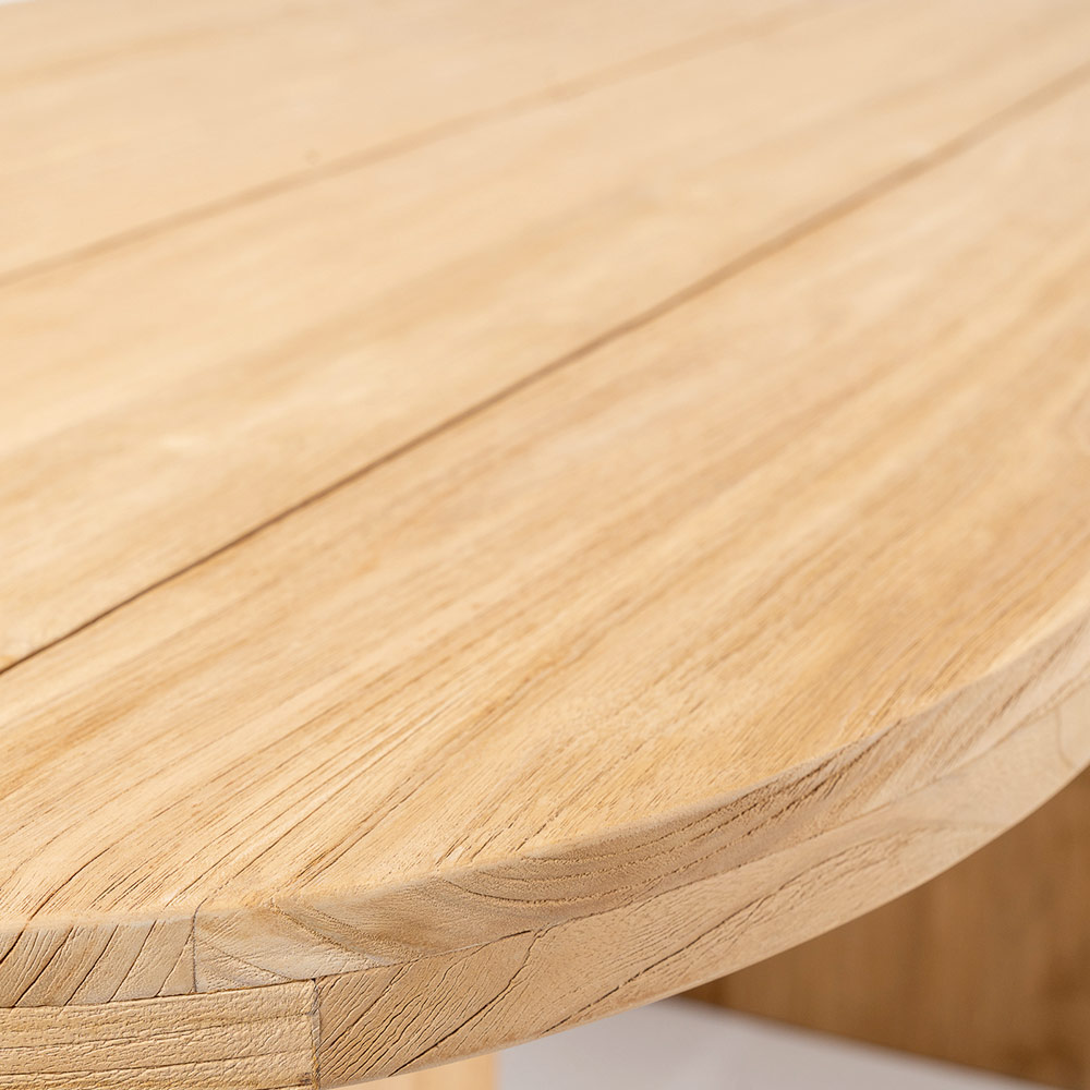Mesa con tapa de teca cepillada con lamas longitudinales y esquinas redondeadas.