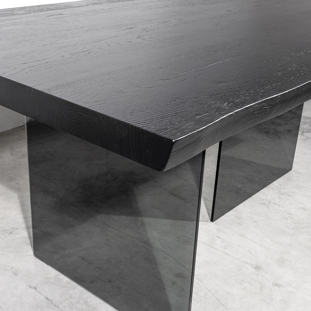 El sobre de esta mesa está chapado en roble macizo anudado color pizarra   mientras que su base es de cristal ahumado .