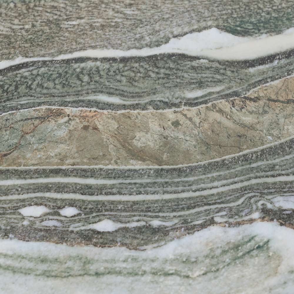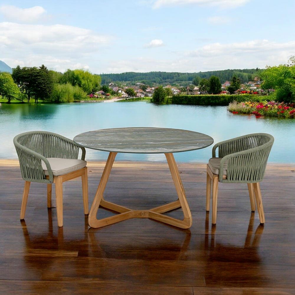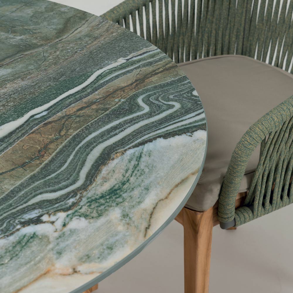 exteriores. La mesa, con su tapa redonda de cerámica, recuerda las serenas olas de un lago alpino, ofreciendo no solo una superficie práctica, sino también un auténtico tema de conversación. La base de madera proporciona
