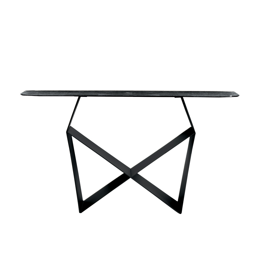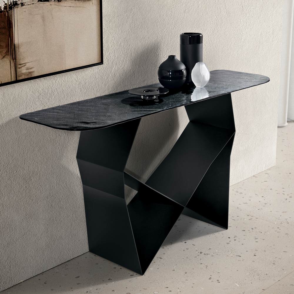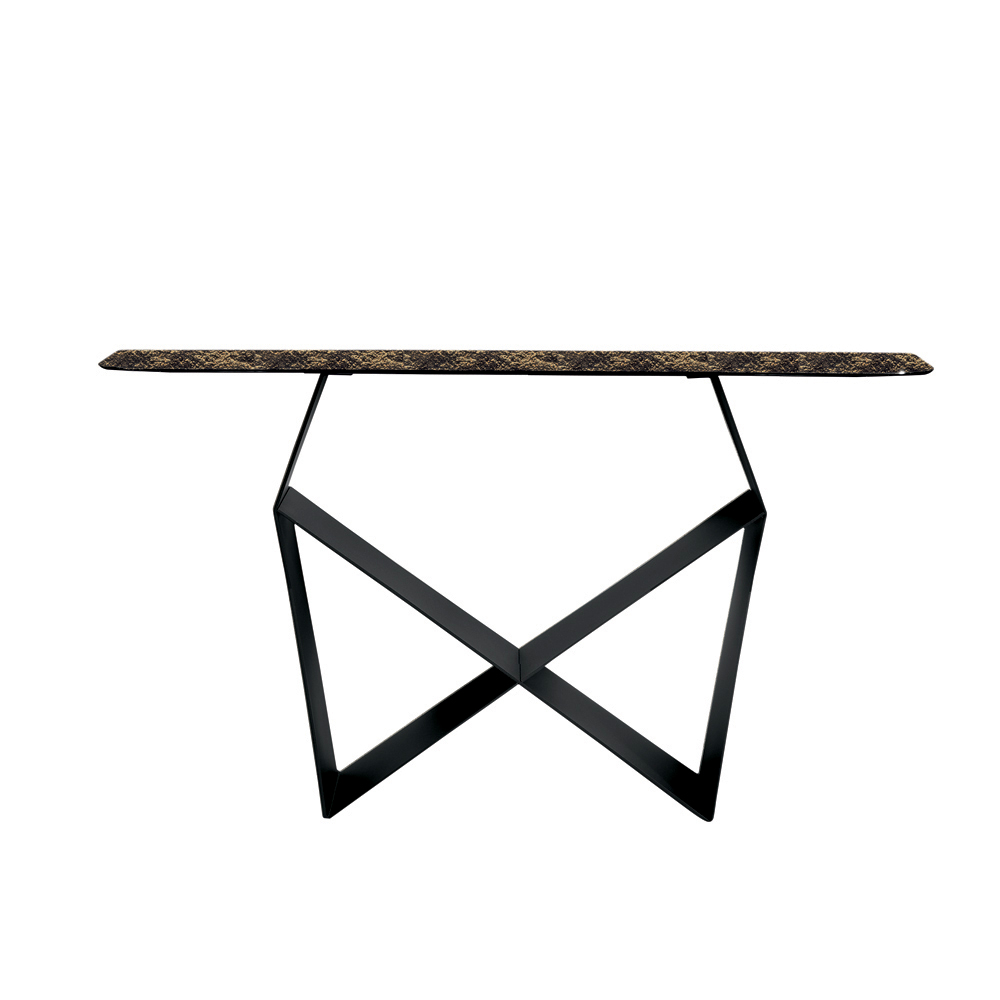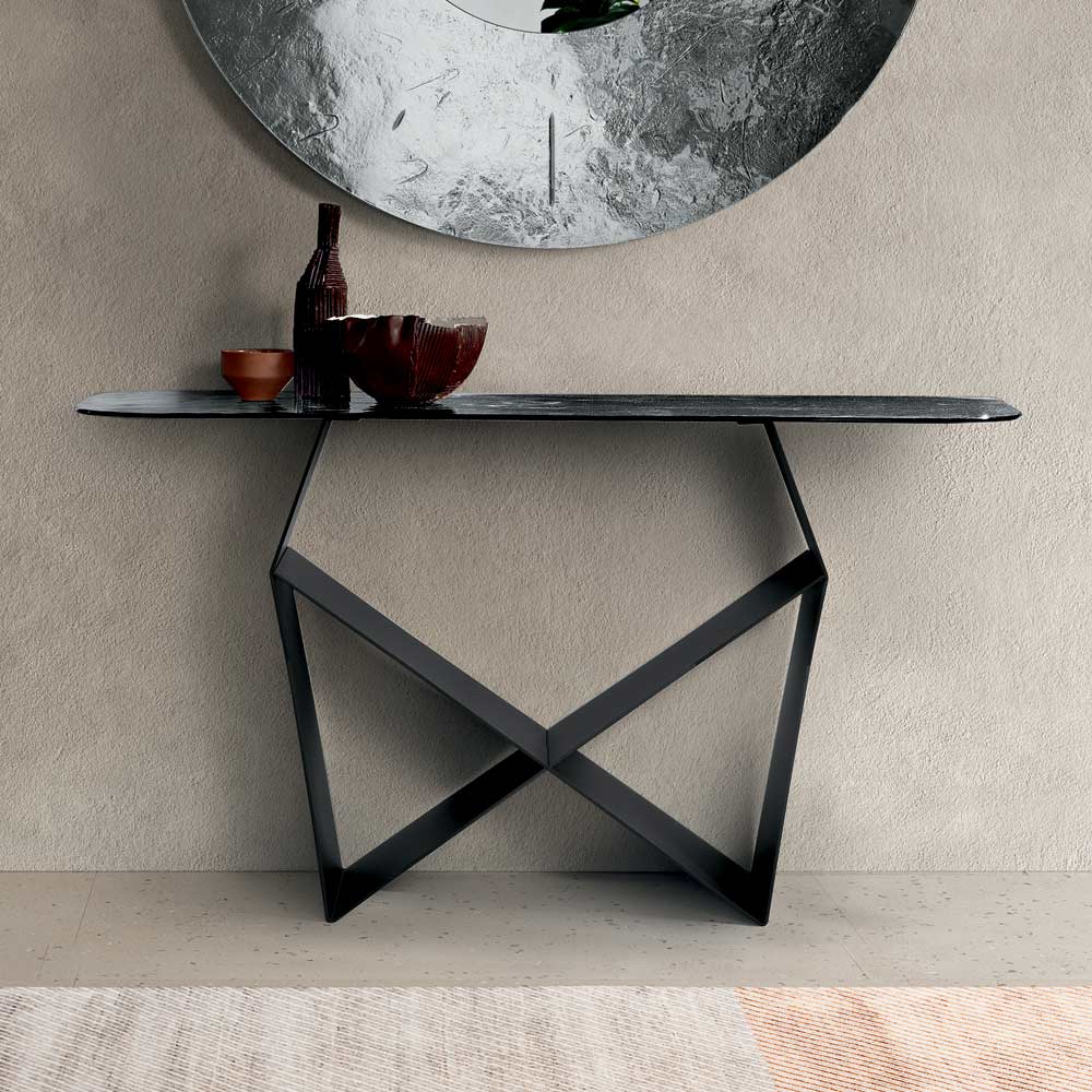 La estructura destaca por su base de metal pintado que crea una original forma de pajarita , generando un refinado juego de sólidos y vacíos. Este detalle aporta dinamismo y fuerza a la composición, dotando a la consola de una presencia impactante pero equilibrada.