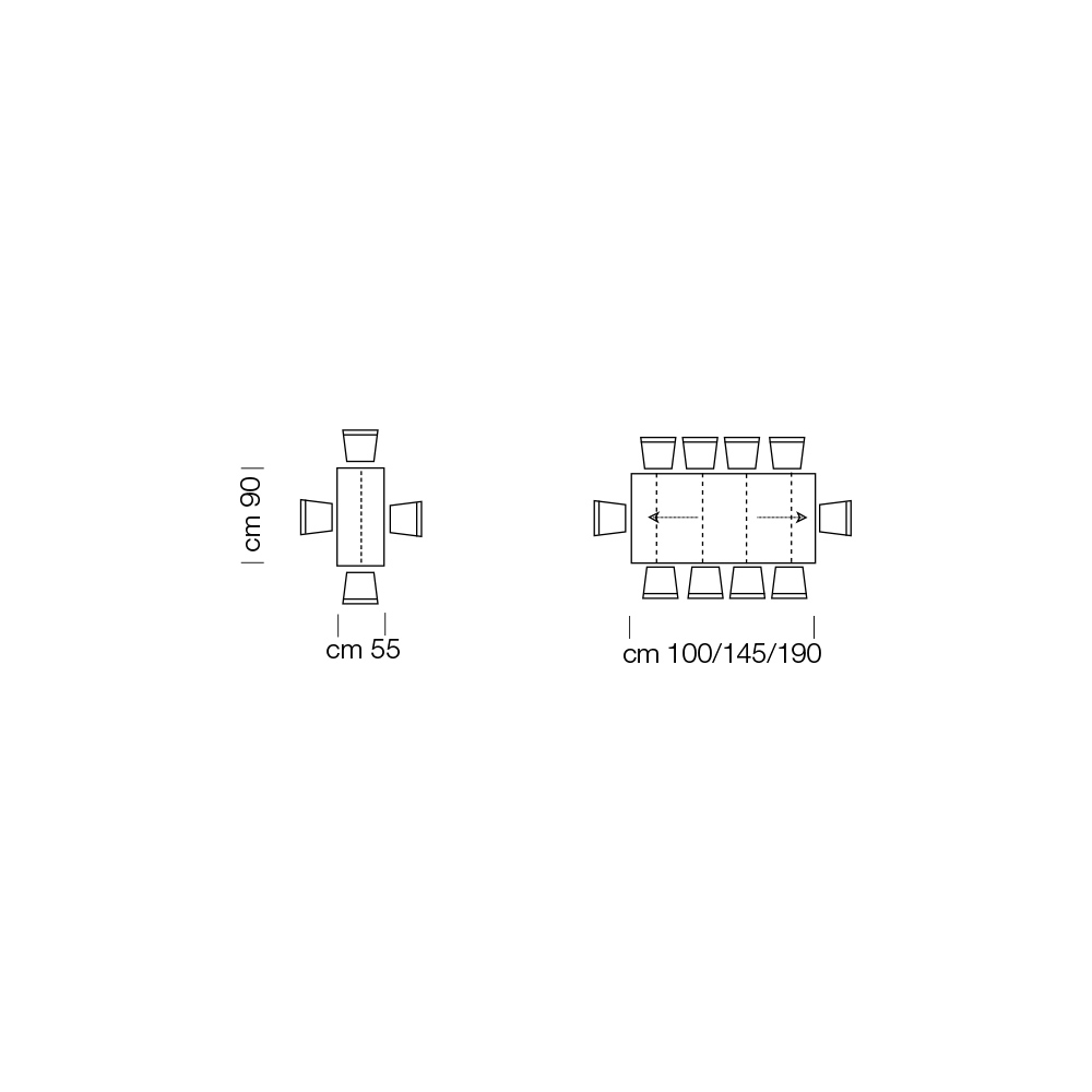 - L 55 (190) x P 120 x H 77 cm 12 plazas extensible con tres extensiones externas de 45 cm cada una.