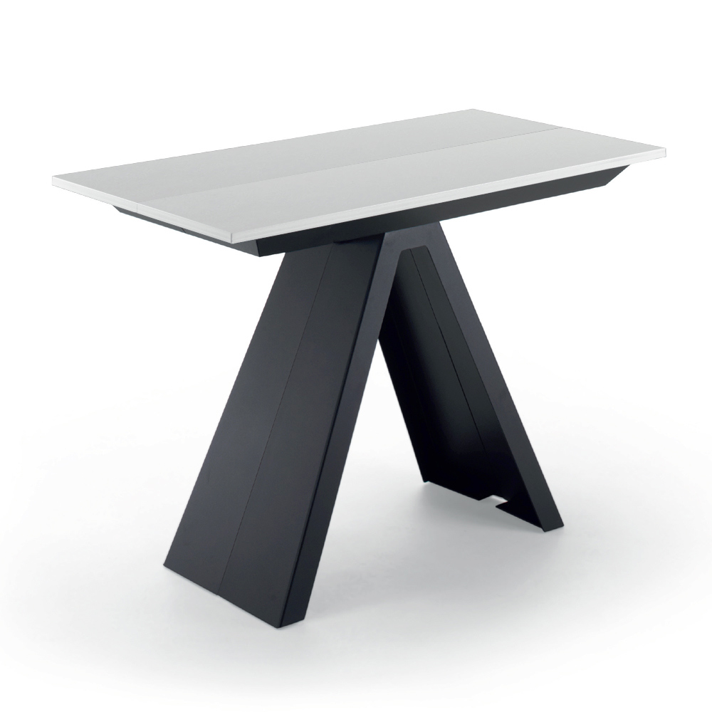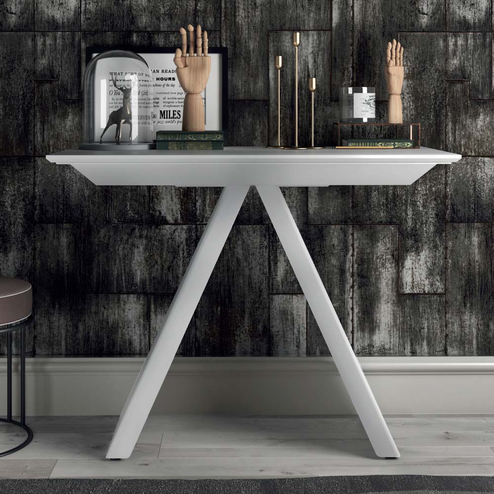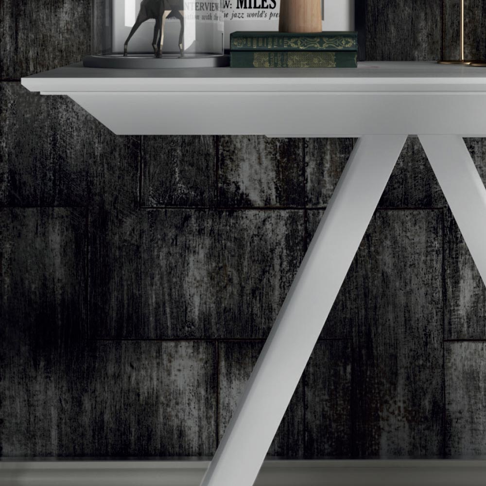 La mesa consola extensible Dalmata contiene toda la practicidad y funcionalidad que un ambiente necesita; Delineado por líneas robustas y elegantes, será perfecto para todos tus ambientes. Hecho a mano en Italia con materiales de excelente calidad y 100% made in Italy. Caracterizado por una tapa de madera laminada.y base en acero lacado en blanco, visón o negro.