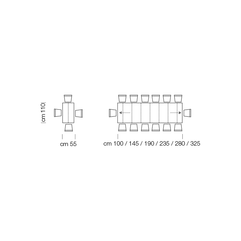 L 55 (325) x P 110 x H 73,5 cm 14 plazas extensible con seis extensiones externas de 45 cm cada una.