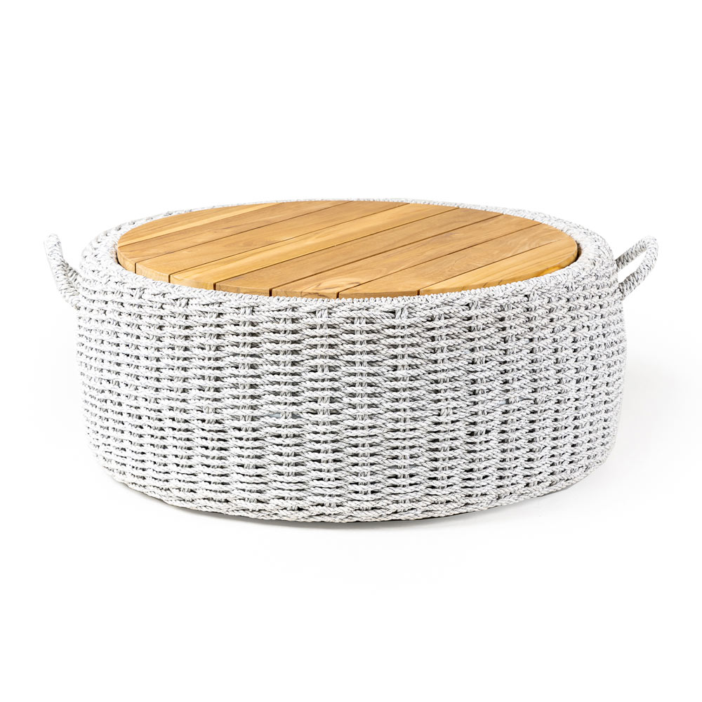 Esta mesa de centro de exterior está fabricada con una estructura interna en aluminio con recubrimiento de polvo epoxi, marco con base de teca e inserto de cuerda VRO tejida a mano. Esta colección combina la belleza de la teca con la sabiduría artesanal del tejido.