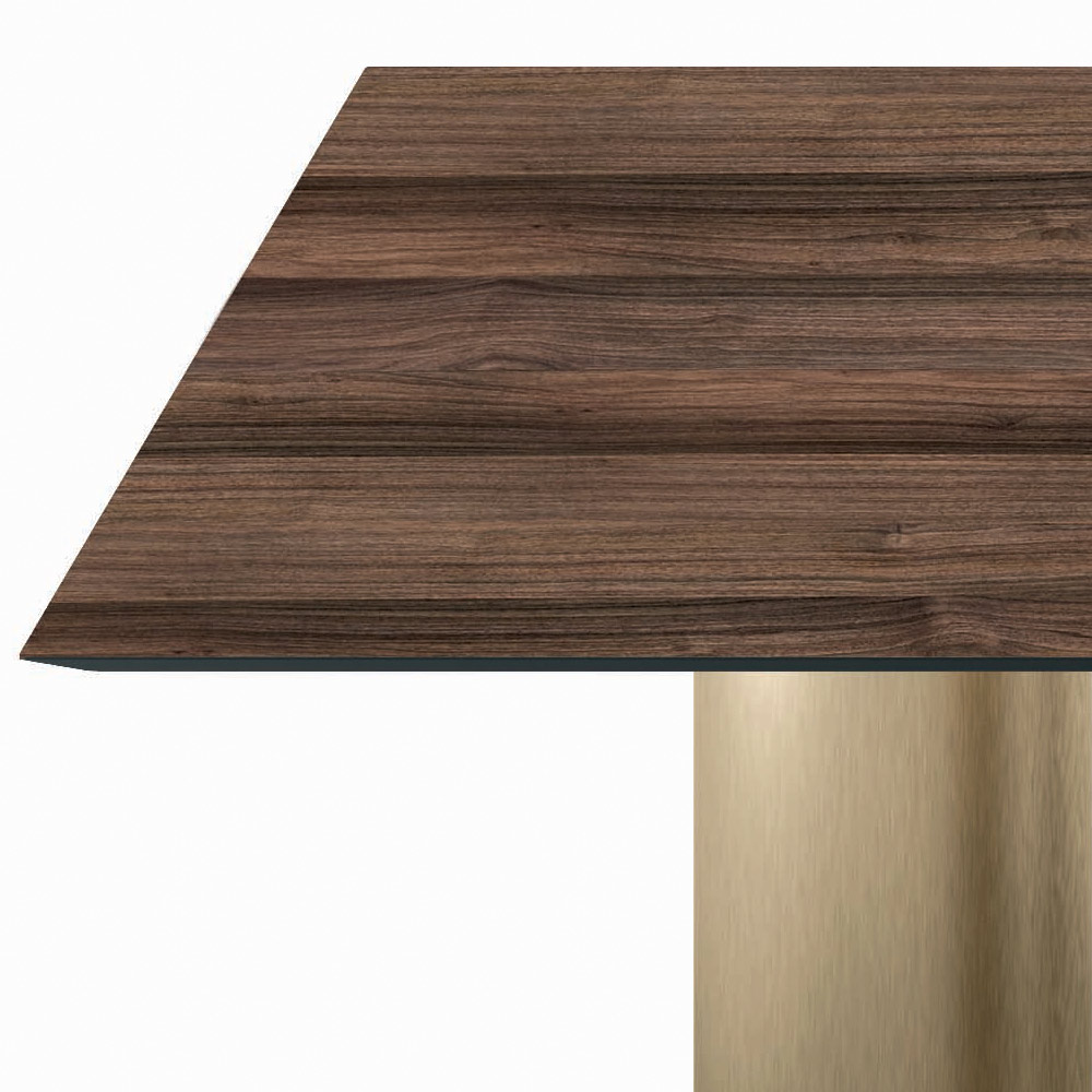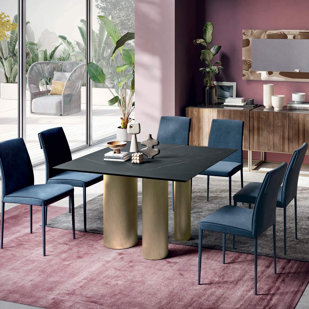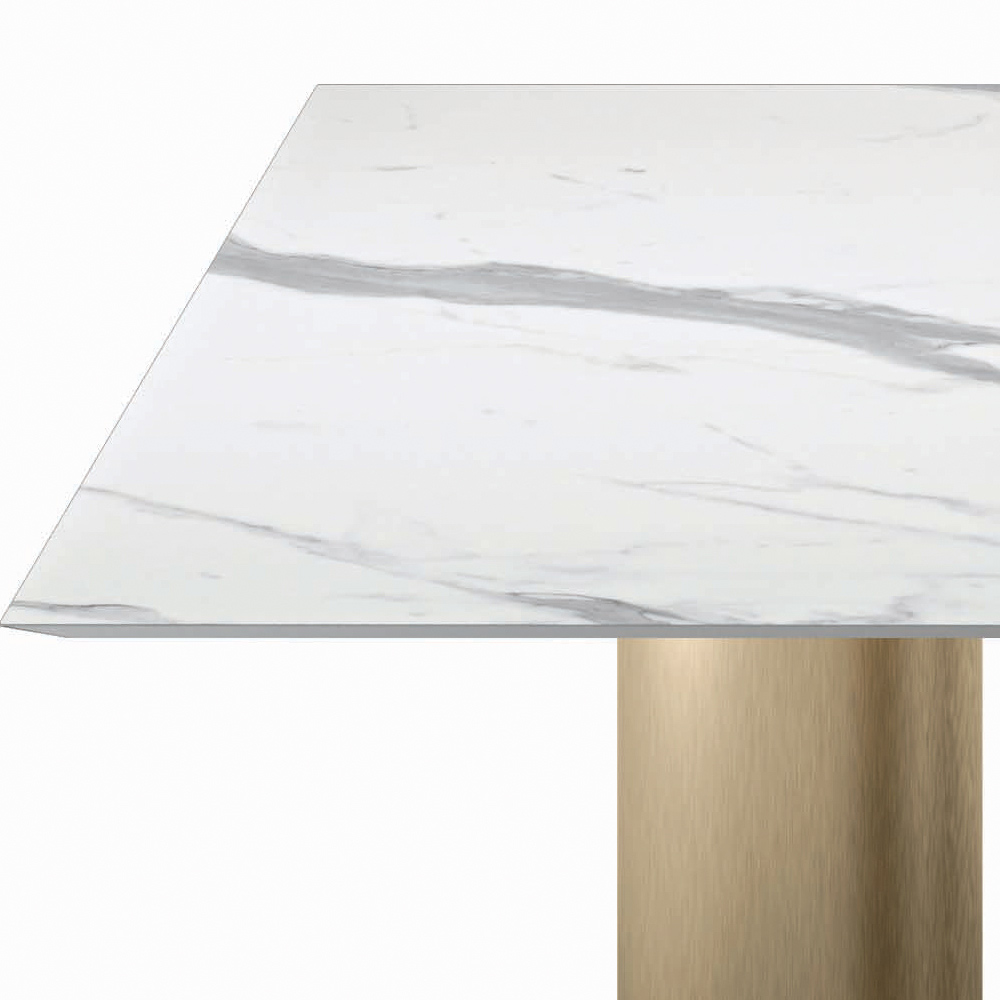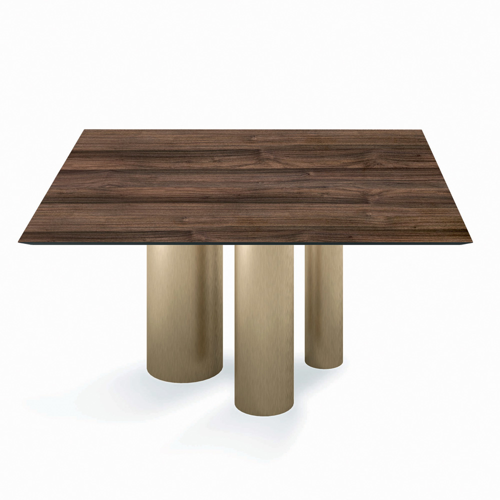 Mesa de salón fija cuadrada con tapa de laminado , biselado 30° , base de acero lacado champagne y pies regulables. El elemento característico de este producto es la base formada por 3 cilindros de diferentes tamaños que le confieren una elegancia y refinamiento únicos . Esta mesa puede completar y personalizar cualquier ambiente cotidiano y contract, respondiendo mejor a las más diversas necesidades de diseño. Está fabricado íntegramente en Italia eligiendo materiales de primera calidad y prestando atención a cada detalle.