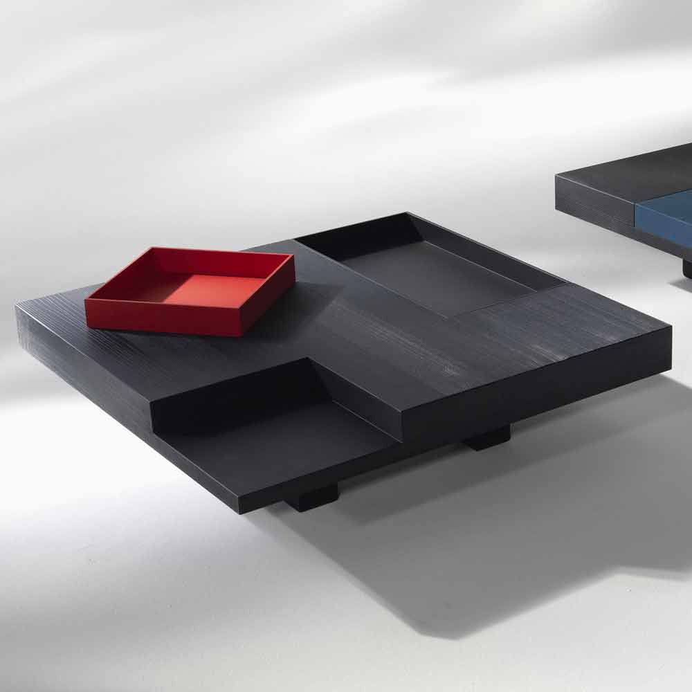 bandejas de mesa cuadrada Iris diseño moderno, incorporados removibles, hechos en Italia Mesa de centro con bandejas extraíbles e incorporada por colores. Top con asiento para 2 bandejas de 30x30 cm y 30x60 cm. Acabado: alerce cepillado. Las bandejas están disponibles en los siguientes colores: lacado negro, rojo, azul o amarillo. Ver carta de colores y en el cuadro indica el código de color deseado.
