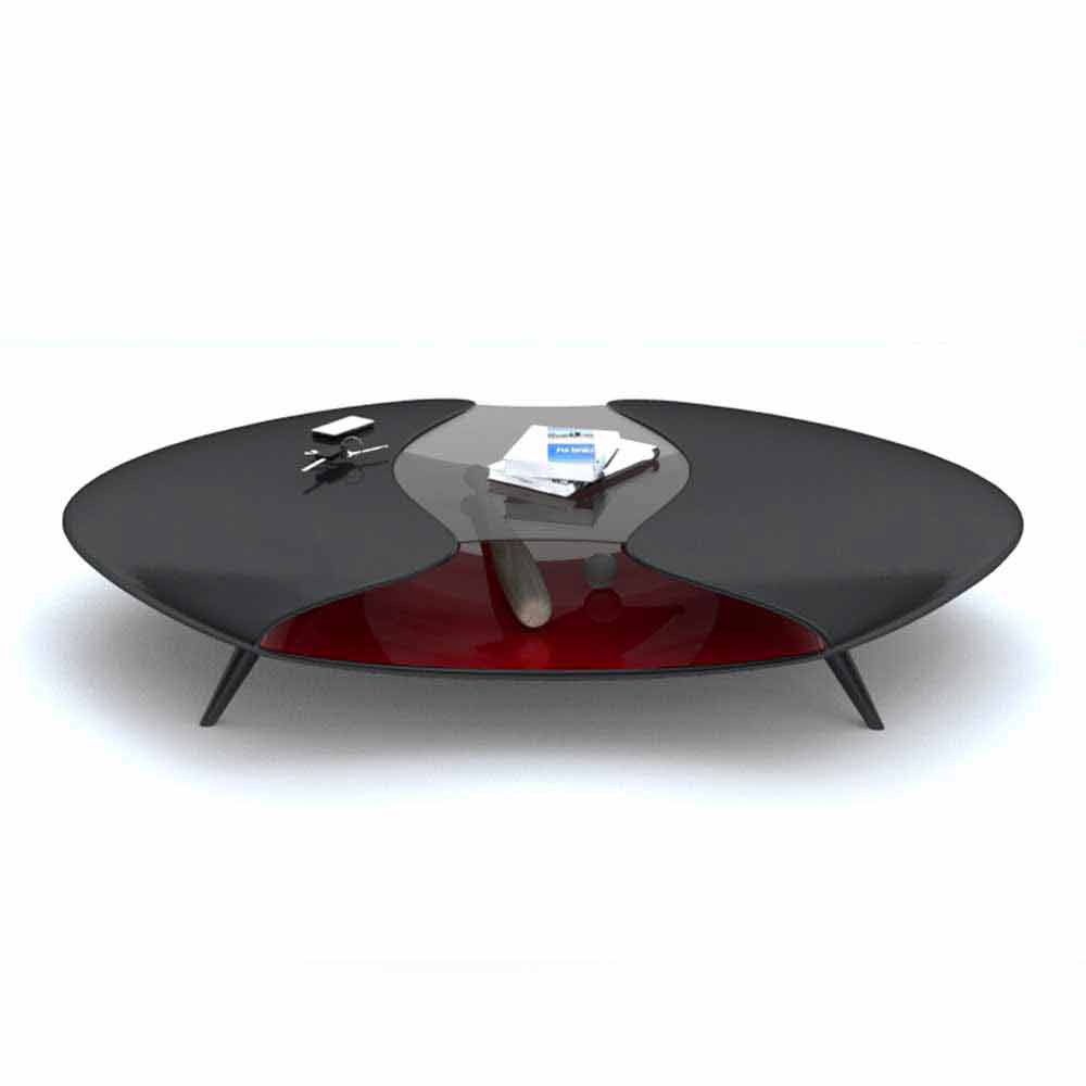 Tiene una conformación redondeada y estirada a lo largo de su eje transversal al mismo tiempo. Generada por geometrías elípticas, destaca no sólo por su forma, sino también por las dos aberturas de acceso a la balda intermedia con la que está equipada, también utilizada para contener o almacenar incluso objetos de gran tamaño.