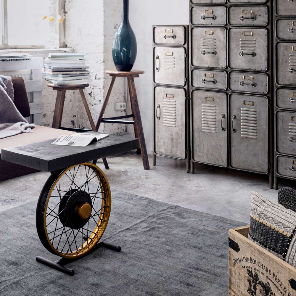 Mesa de centro para salón en acero y mango de diseño industrial con rueda.