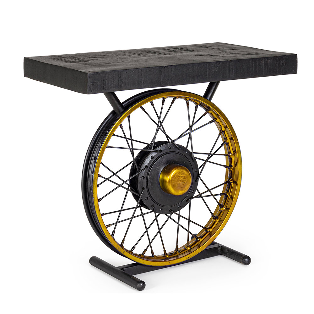 Esta mesa de centro está fabricada con estructura de acero y tapa de madera de mango para montar. El diseño industrial y original se caracteriza por la base en forma de rueda.