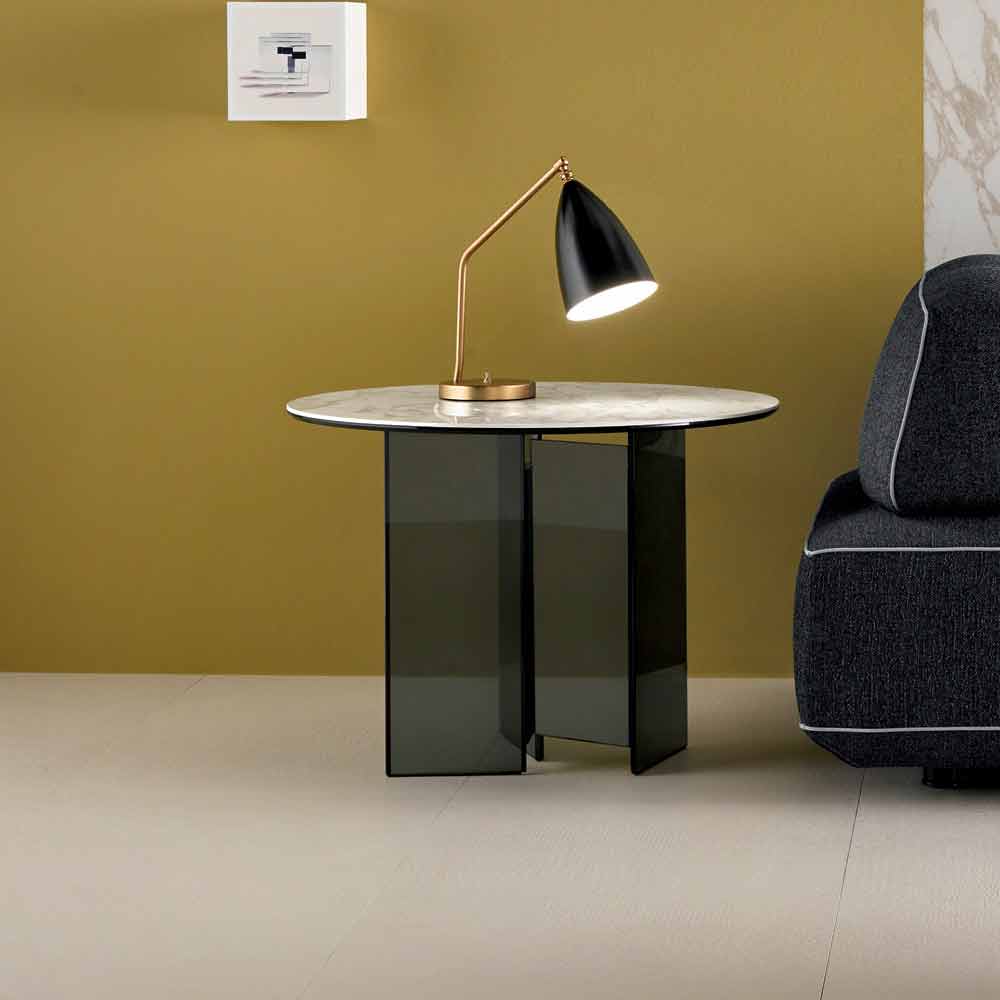 Hecho de vidrio ahumado para la base y una tapa de cerámica calacatta arabescos pulidos , es un mueble hecho a mano en Italia con materiales de alta calidad ideal para la sala de estar.