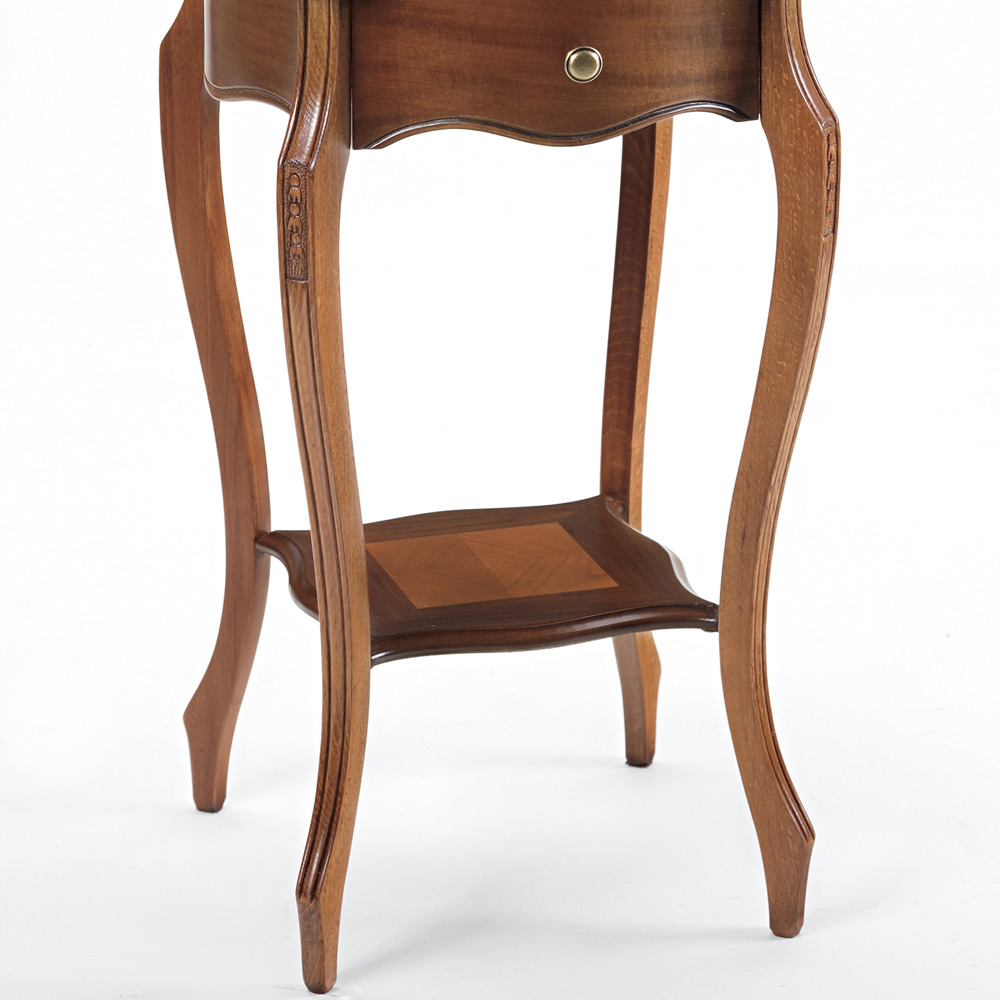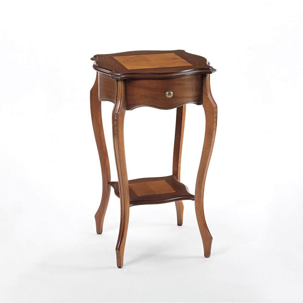 Mesita de interior con estructura de madera maciza , estructuras de aliso , paneles y demás piezas chapadas en cerezo con incrustaciones y 1 cajón íntegramente Made in Italy.