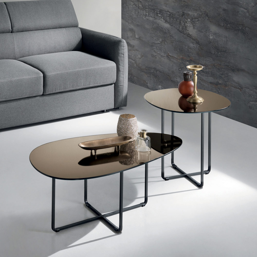 La superficie está disponible en cristal espejado , que amplifica la luminosidad del espacio, o en cerámica con efecto mármol sobre cristal , una solución que combina durabilidad y refinamiento estético. Esta doble opción permite personalizar la mesa para adaptarla al estilo de la habitación.