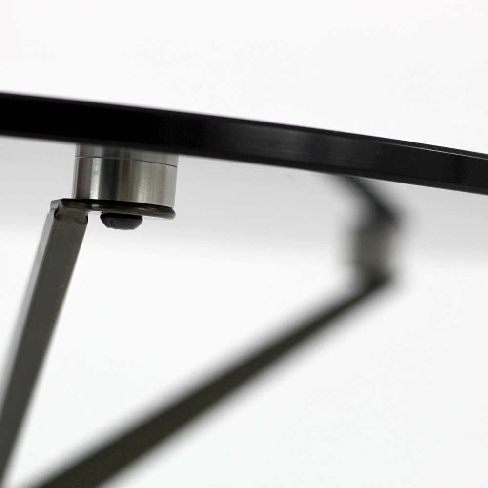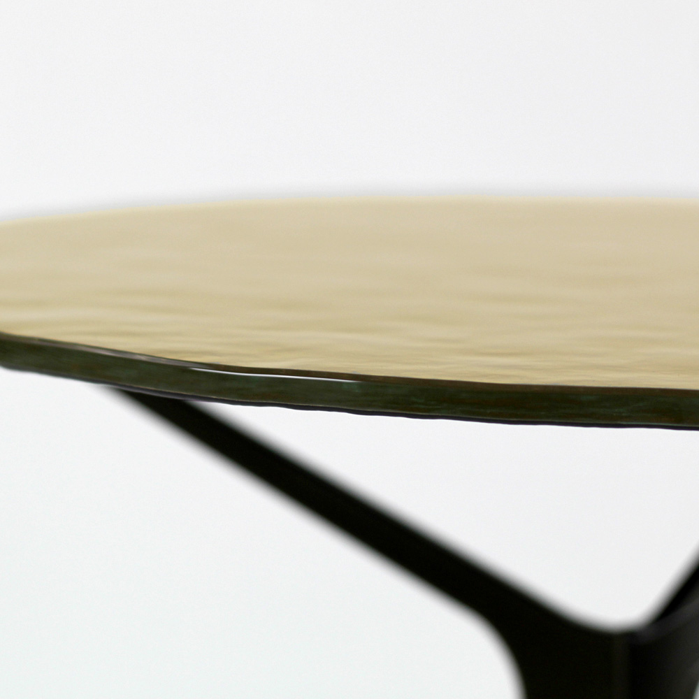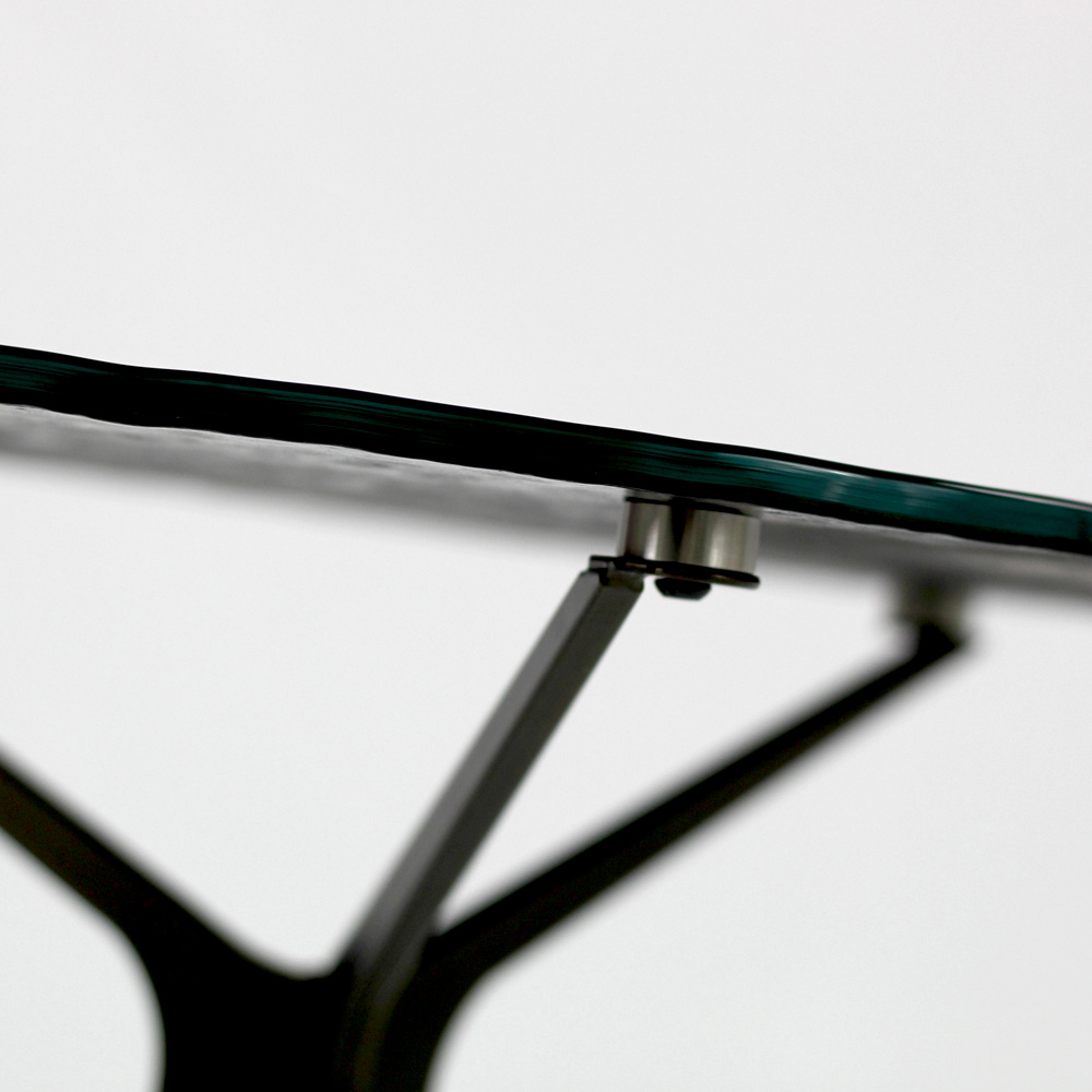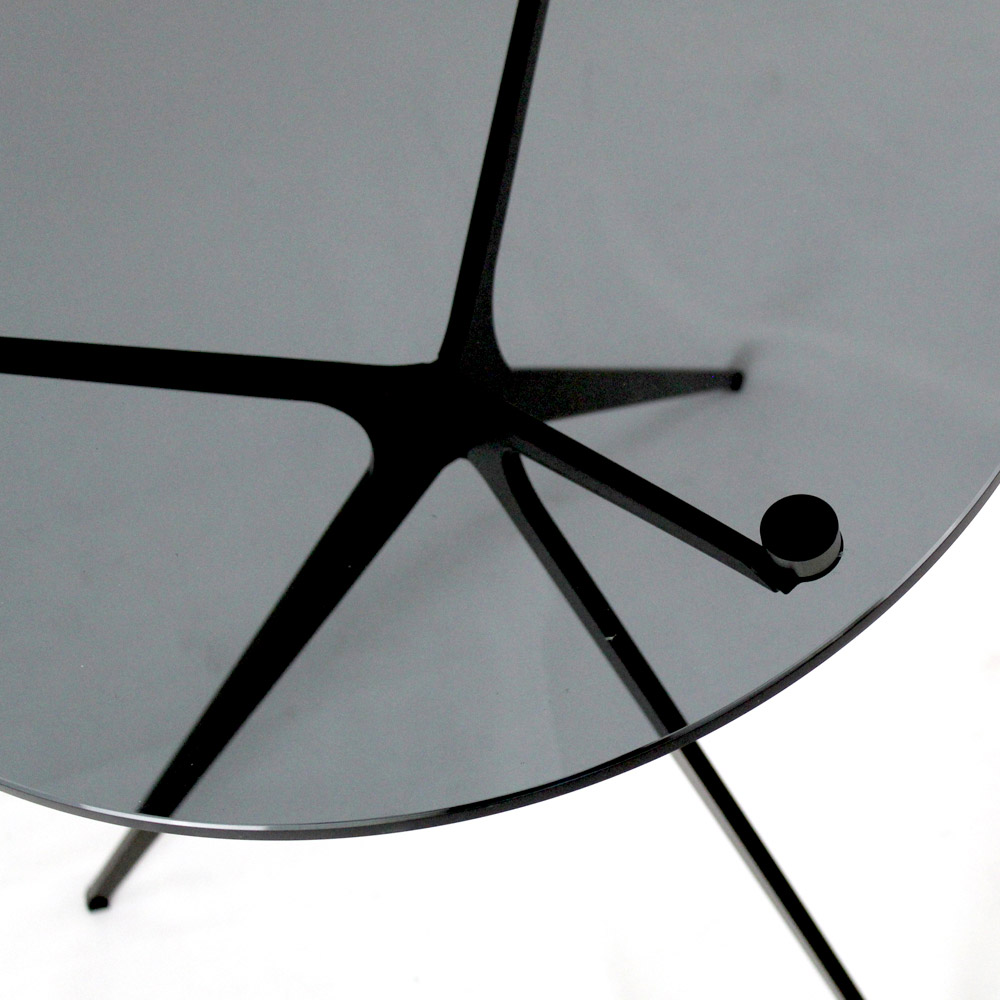 Mesa de centro redonda con base de acero pintado y tapa de cristal.