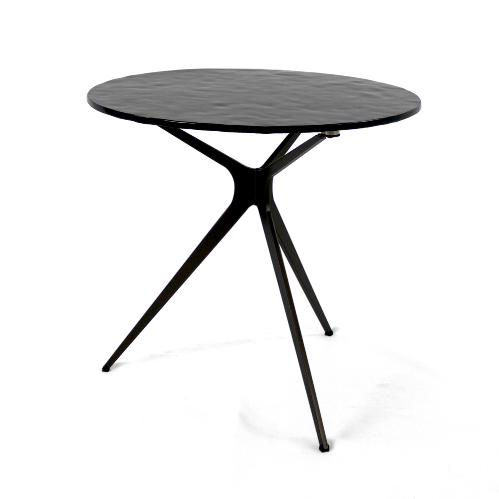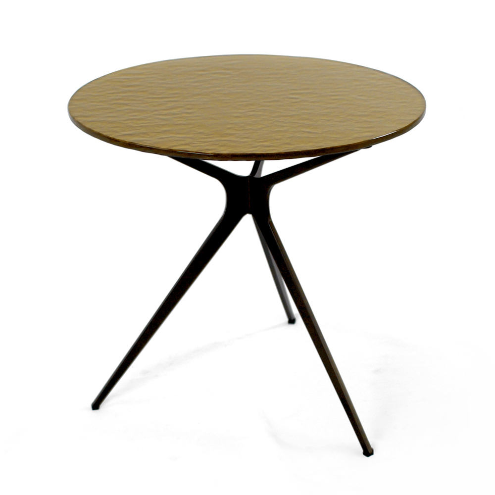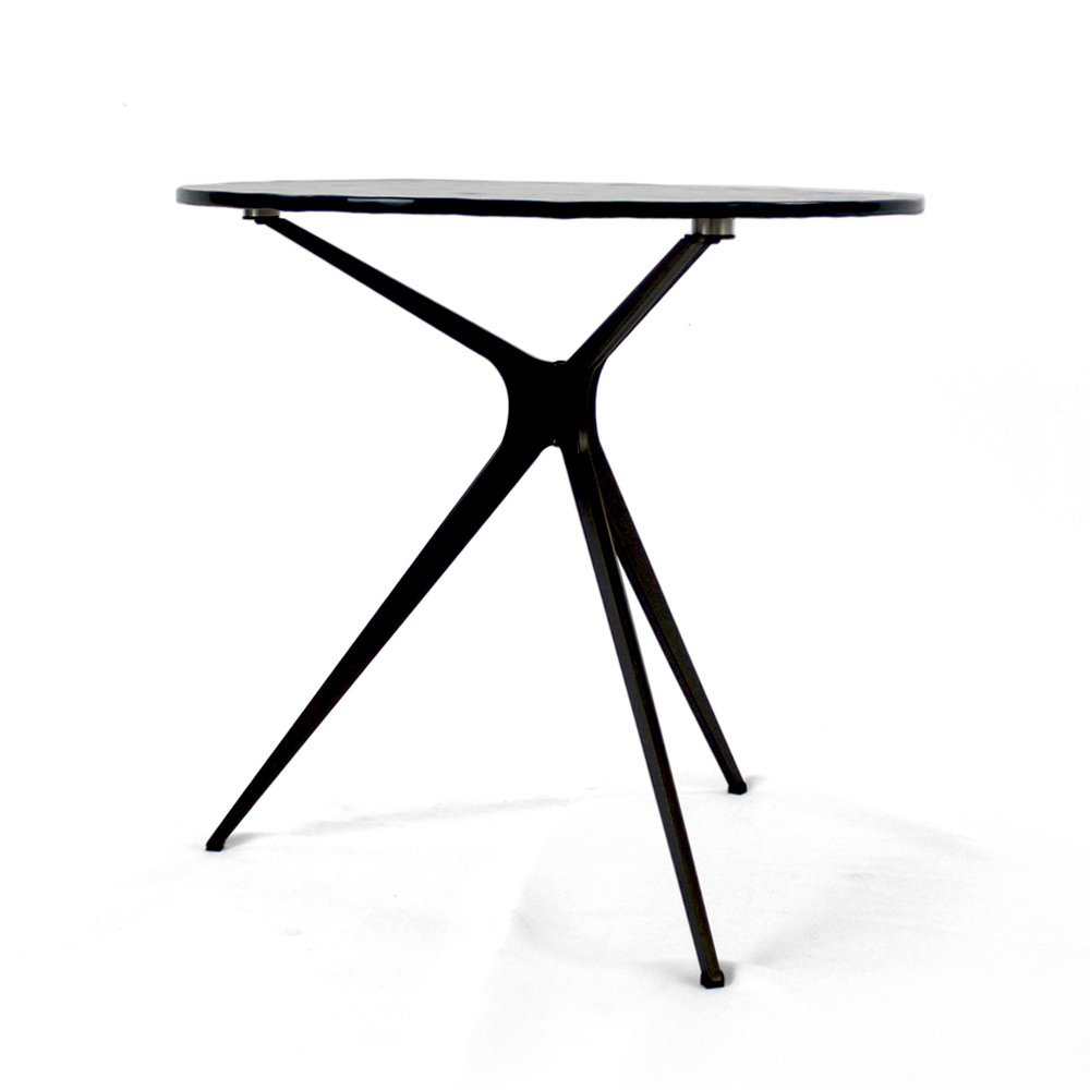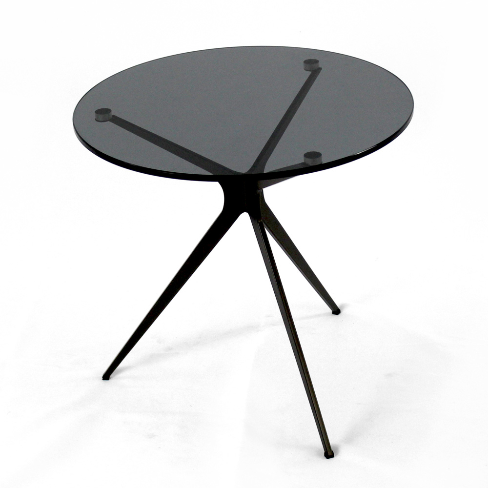 Mesa de centro redonda con base de acero pintado y tapa de cristal.