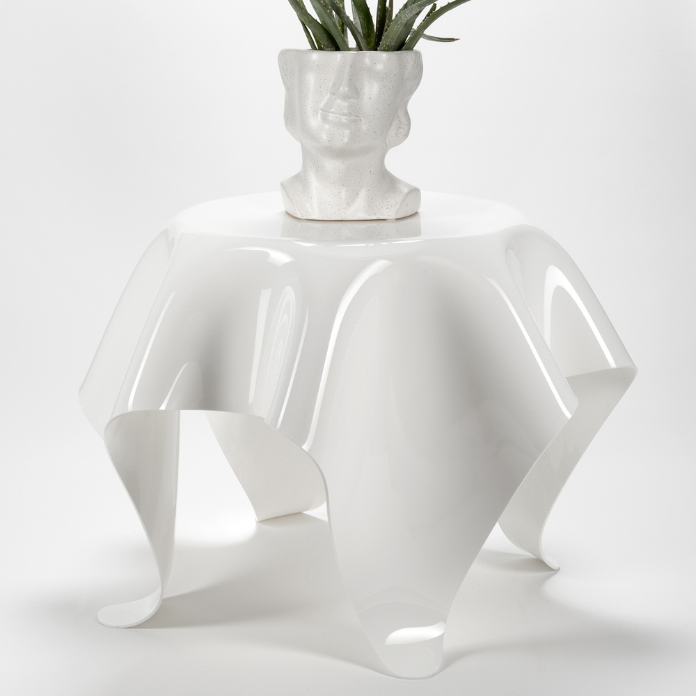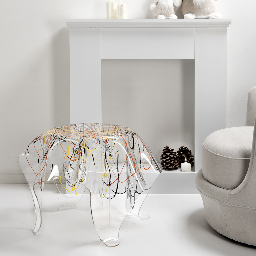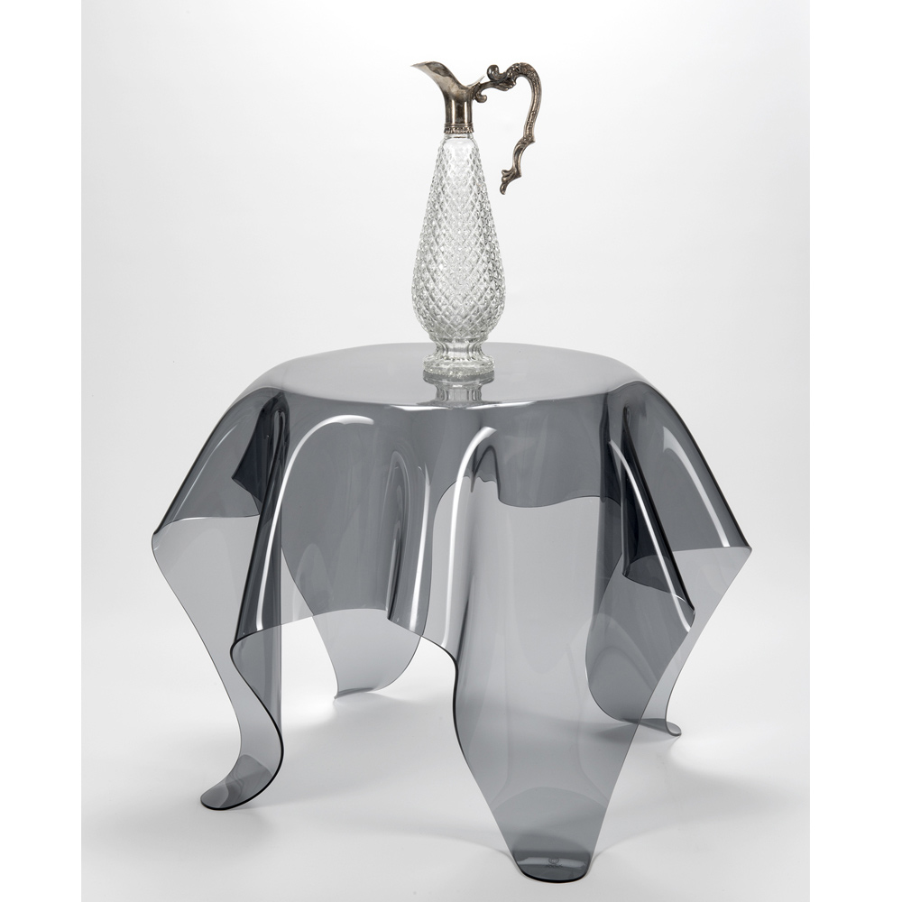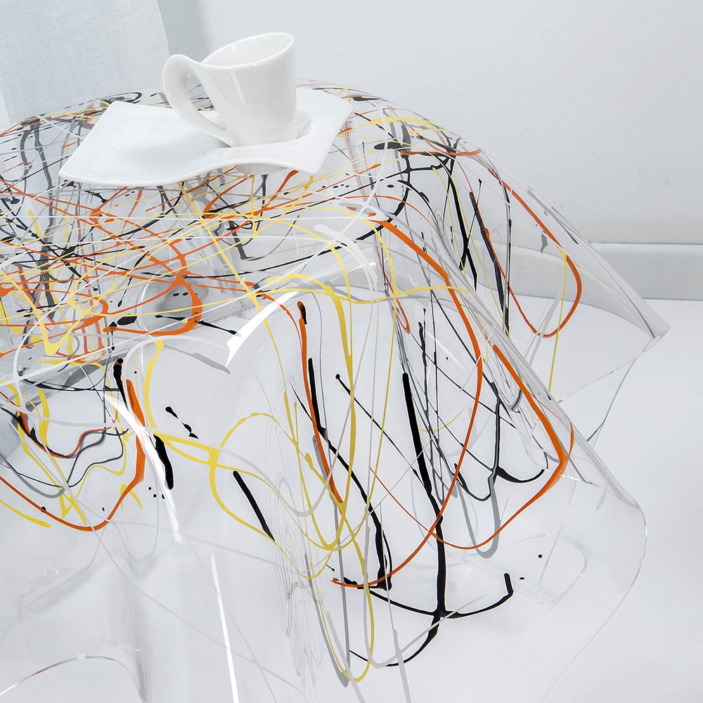 Mesa de centro fabricada en plexiglás 100% PMMA procedente de polímero virgen. Una solución de decoración original y contemporánea caracterizada por elegantes cortinas hechas a mano que subrayan su singularidad y valor. Diseñado para la sala de estar o el dormitorio, sirve como un elemento decorativo con una fuerte personalidad moderna al tiempo que ofrece una superficie de apoyo funcional y sólida .