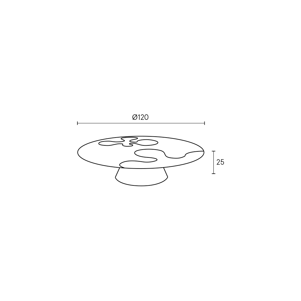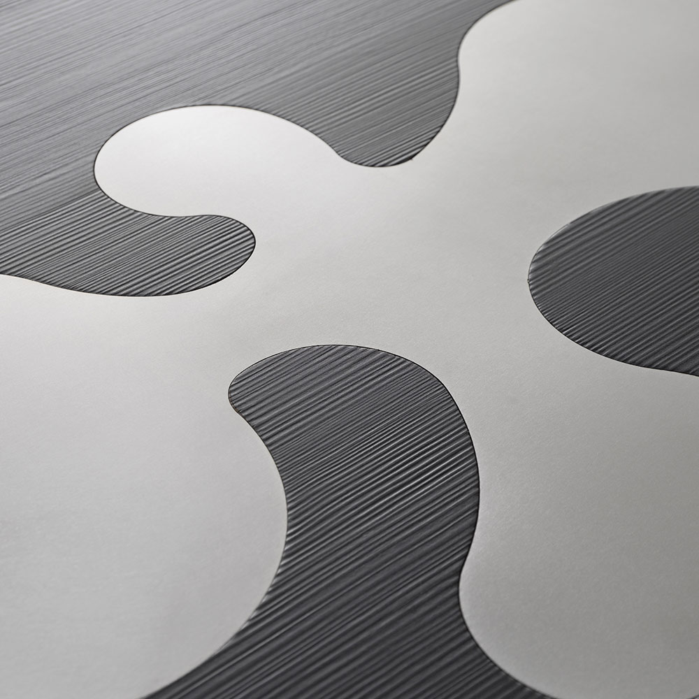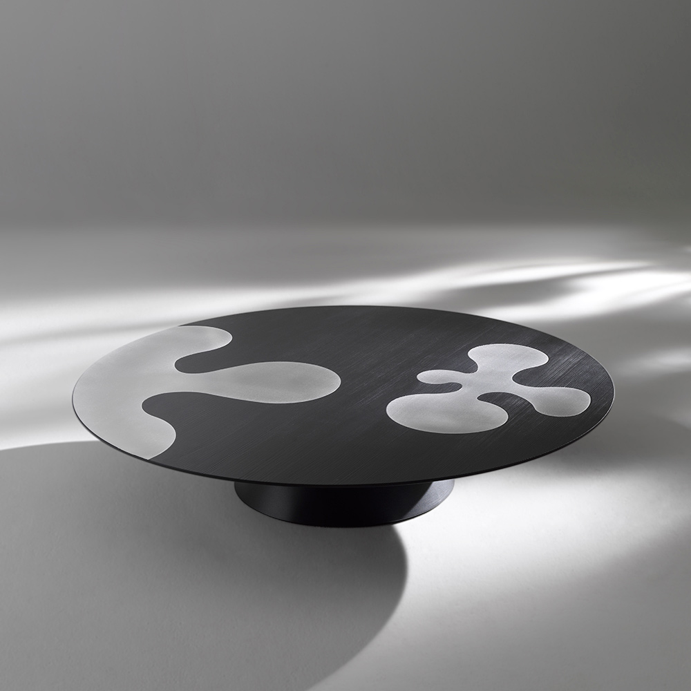 Esta mesa de centro redonda de diseño destaca por su estética gráfica y contemporánea, donde las formas rigurosas se combinan con un refinado juego de materiales contrastantes. El tablero circular se convierte en una superficie verdaderamente expresiva, con inserciones de acero inoxidable satinado que emergen del fondo oscuro como motivos abstractos y dinámicos.