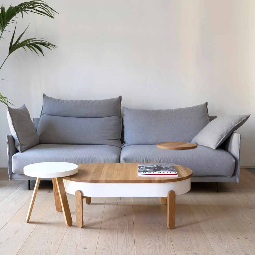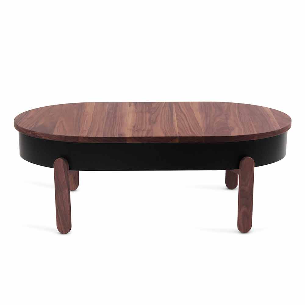 Mesa de centro moderna fabricada en roble macizo y acero lacado.