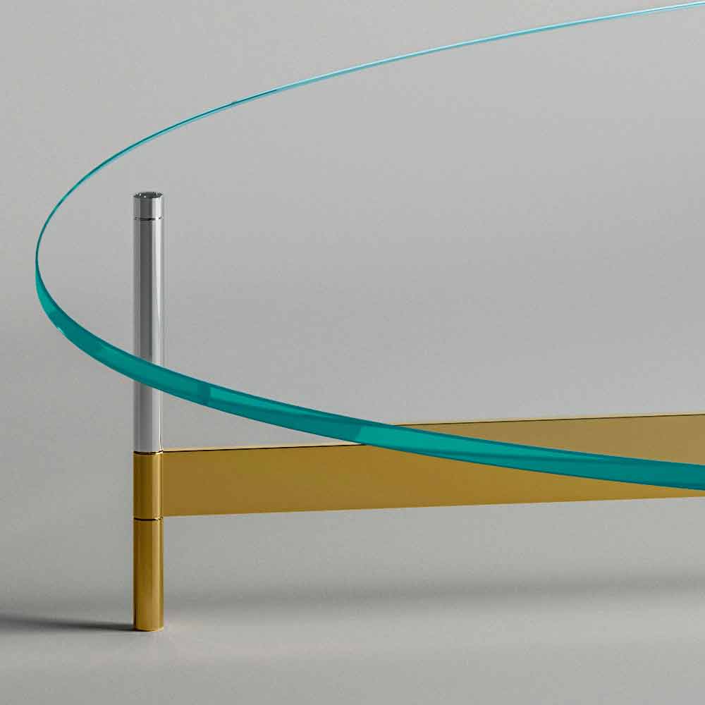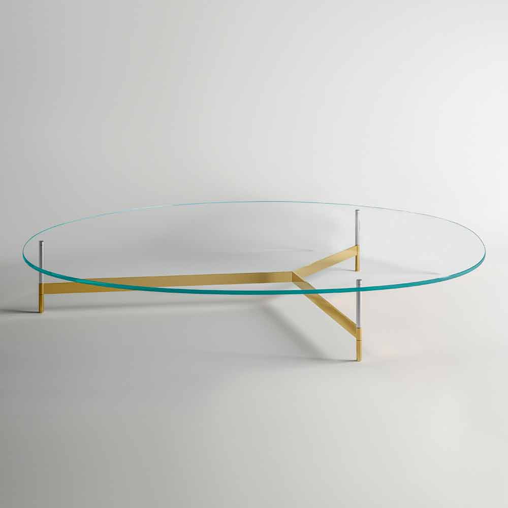 Mesa de centro de diseño con tapa de cristal y base de metal Made in Italy.