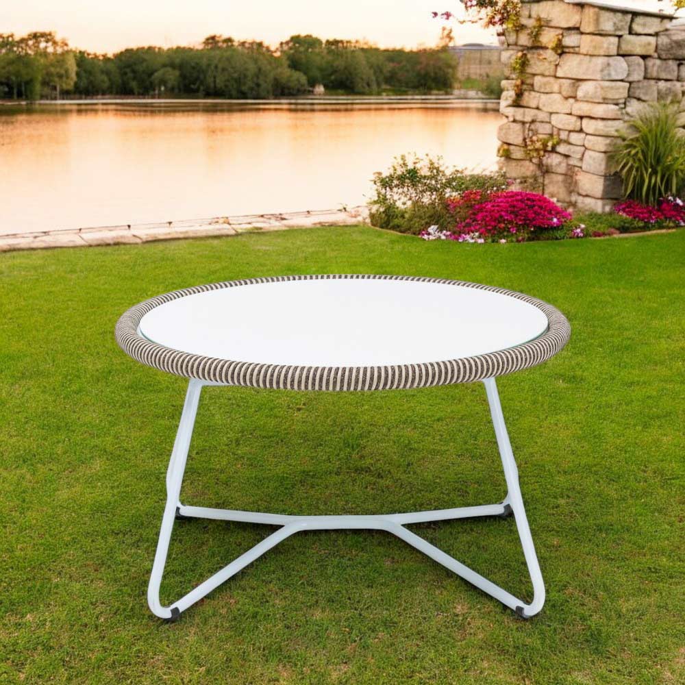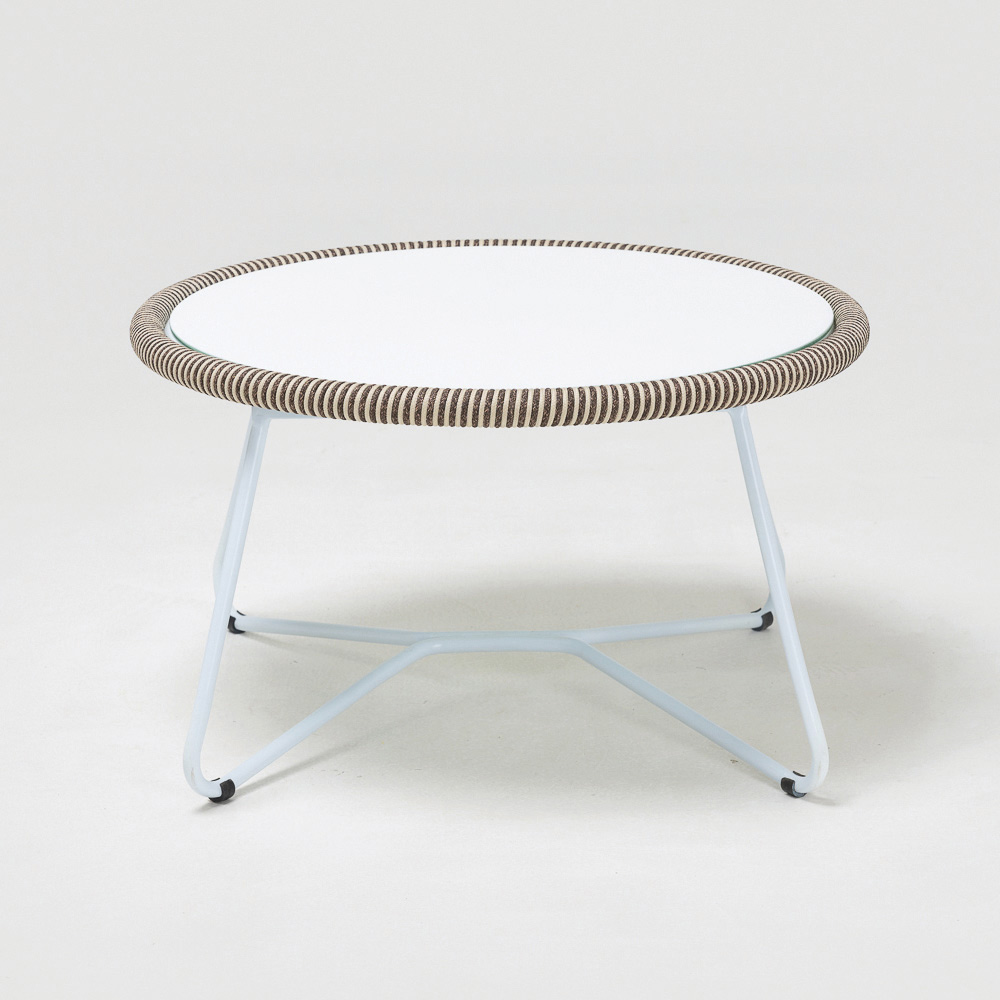 Esta mesa de jardín es el epítome del diseño uniéndose a la funcionalidad en su forma más pura y estilísticamente refinada. El tablero redondo está hábilmente tejido, creando un sugerente efecto visual que atrae la mirada e invita al tacto. La base de aluminio pintado confiere a la mesa una ligereza casi etérea, al tiempo que garantiza su estabilidad y resistencia a las condiciones exteriores.