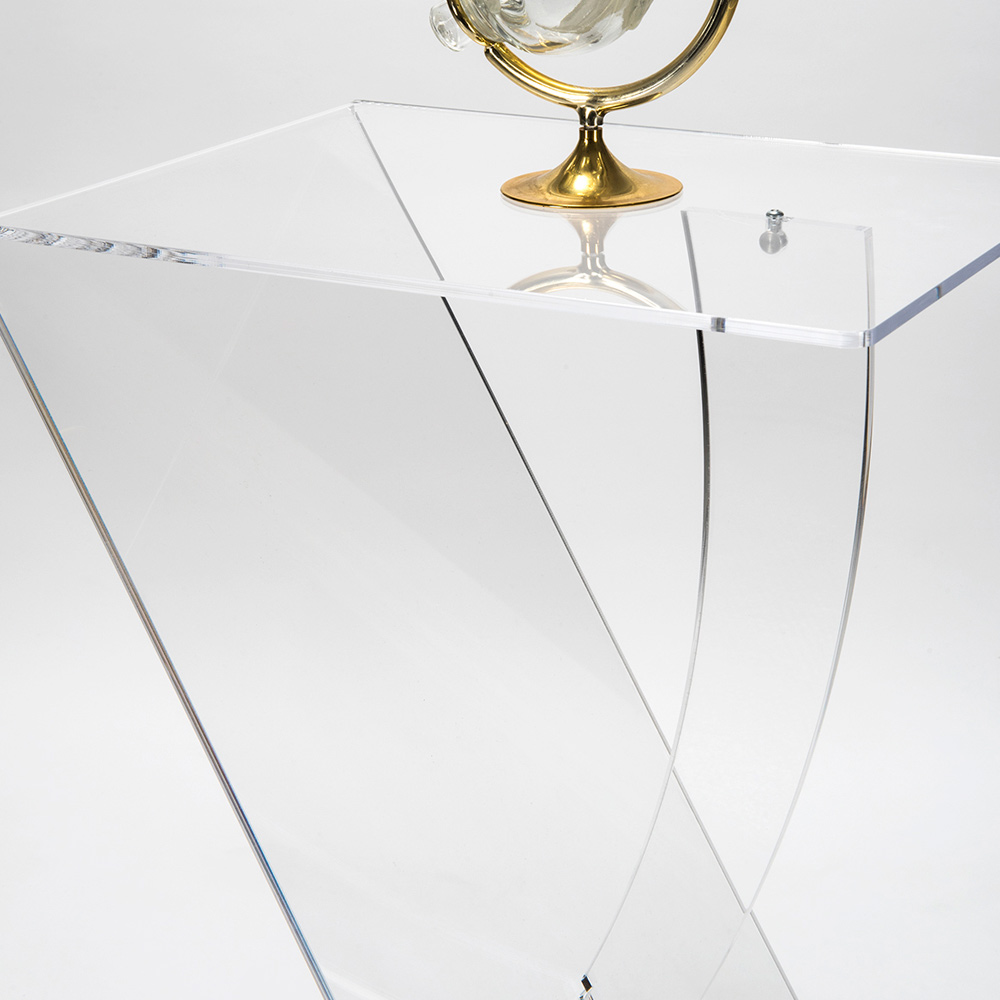 Esta mesa de centro está realizada íntegramente en plexiglás transparente, una elección que realza su versatilidad y resistencia. Con su doble estante, ofrece espacio extra para tus libros, vasos o cualquier objeto que quieras tener a mano, manteniendo siempre un aspecto ordenado y chic.