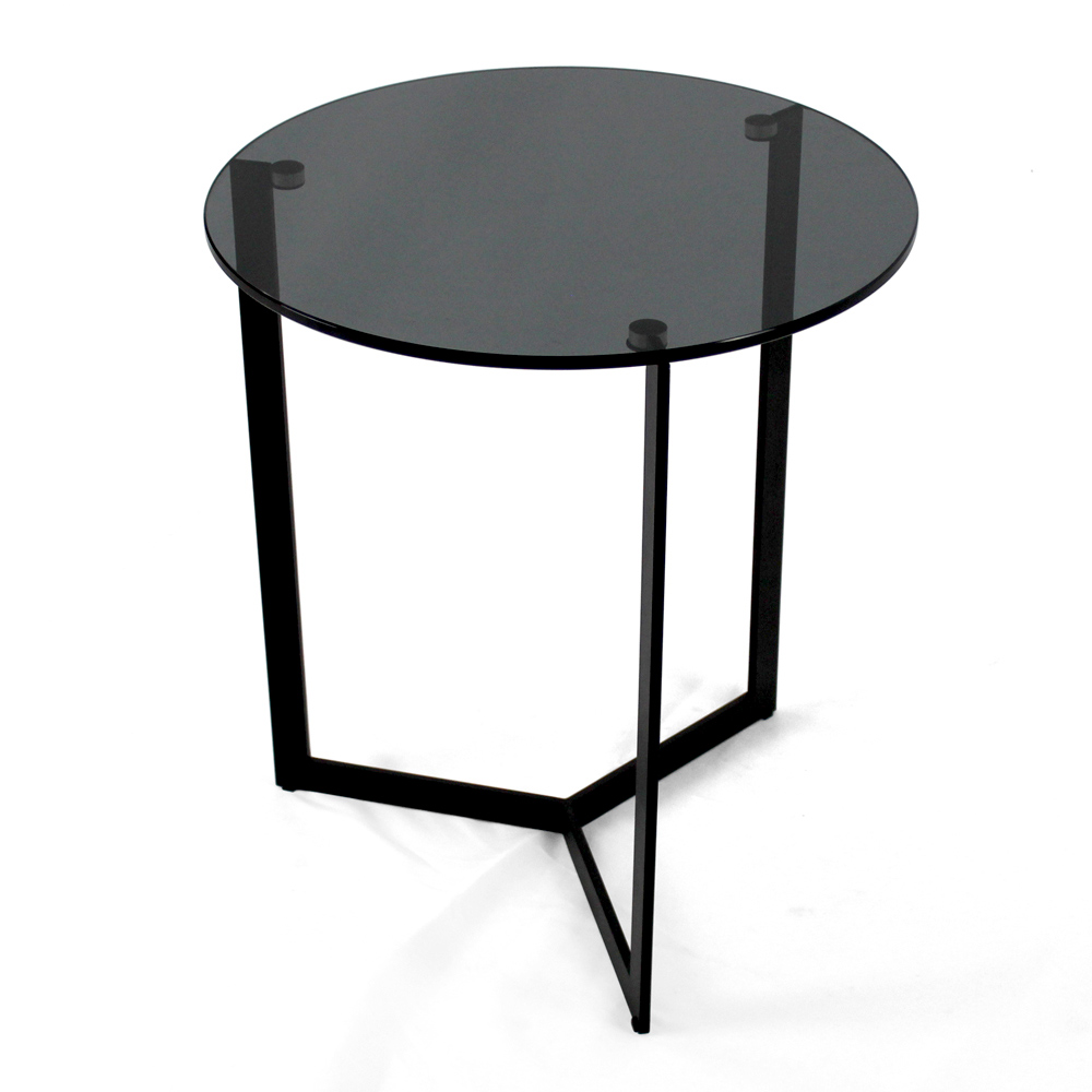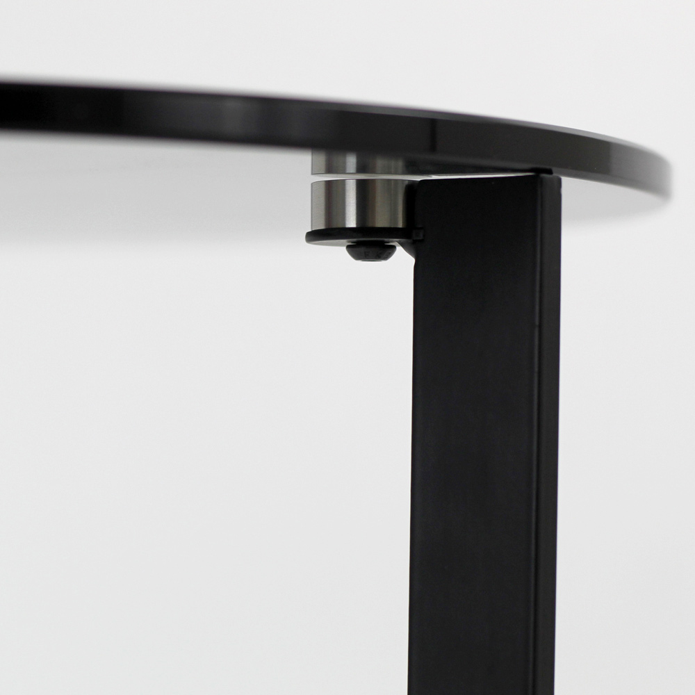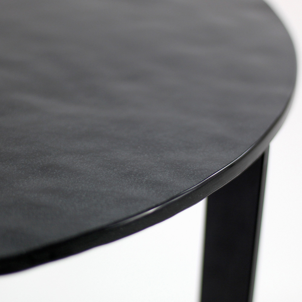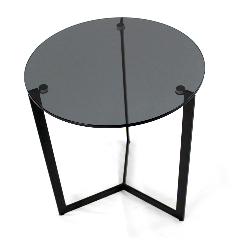 Mesa redonda con base de acero pintado y tapa de cristal.