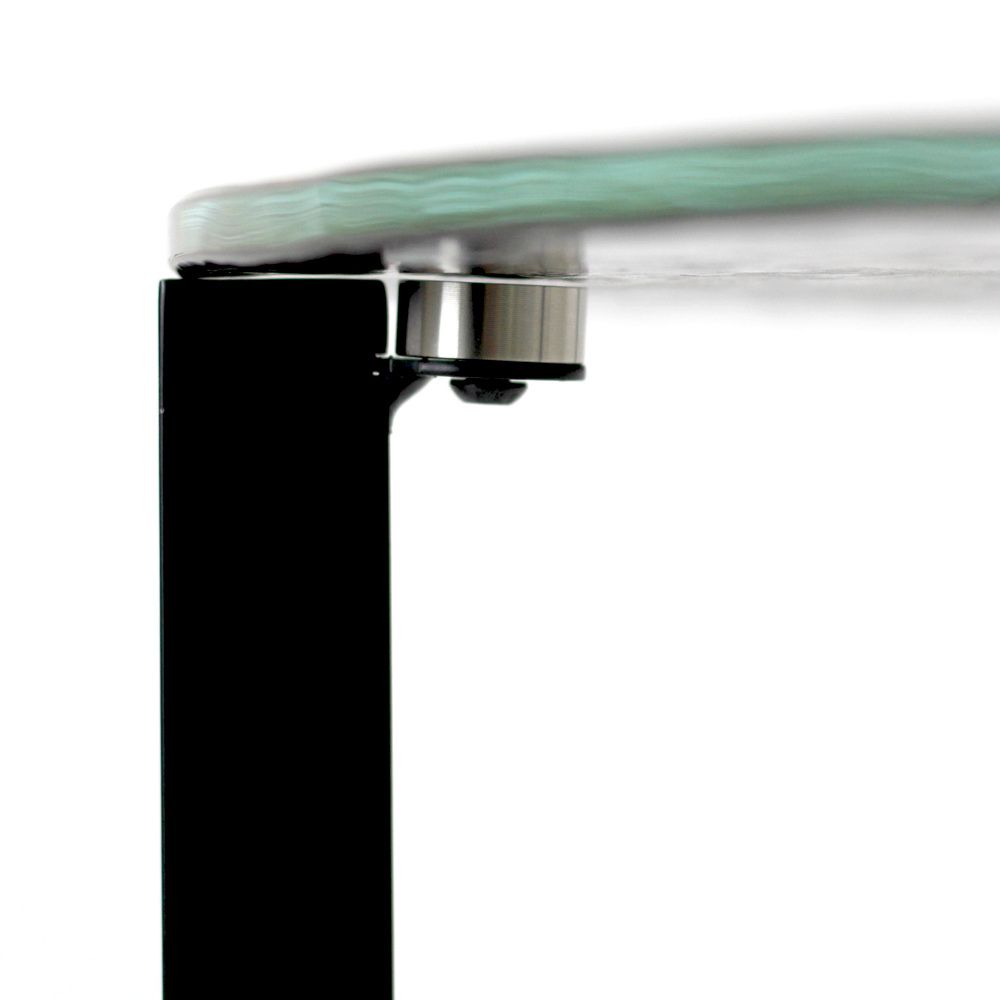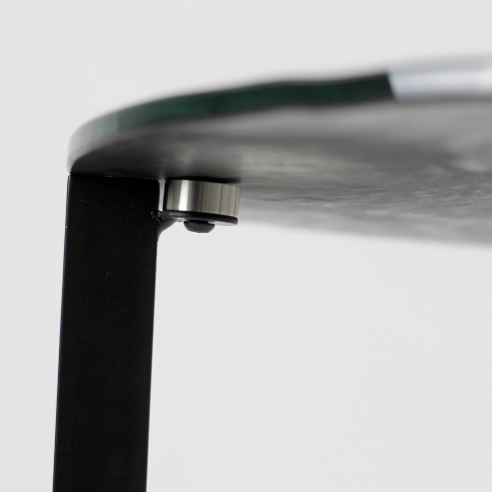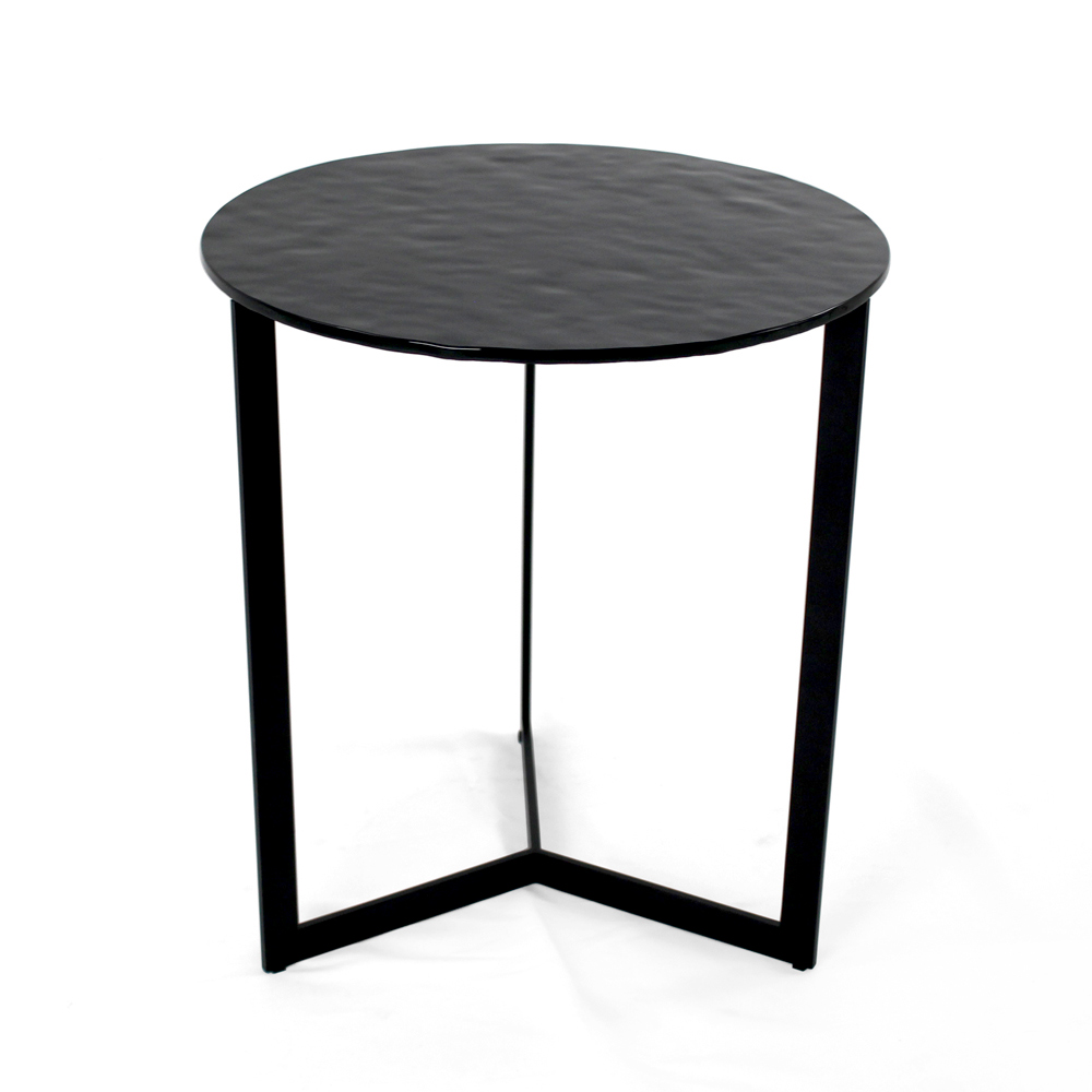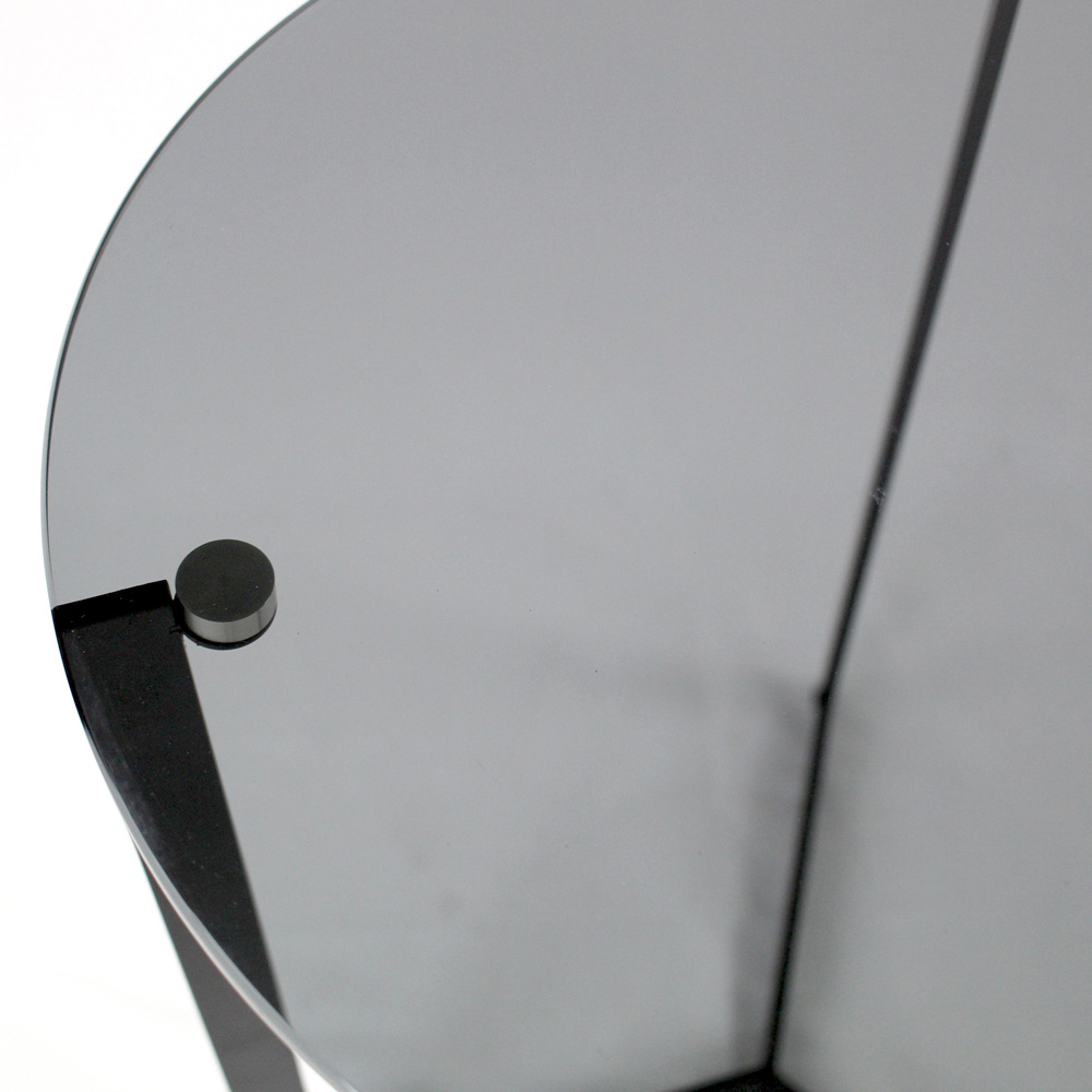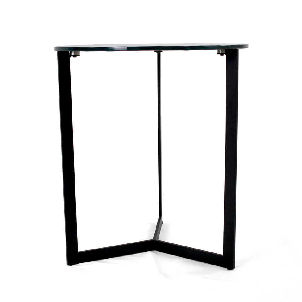 Mesa redonda con base de acero pintado y tapa de cristal.